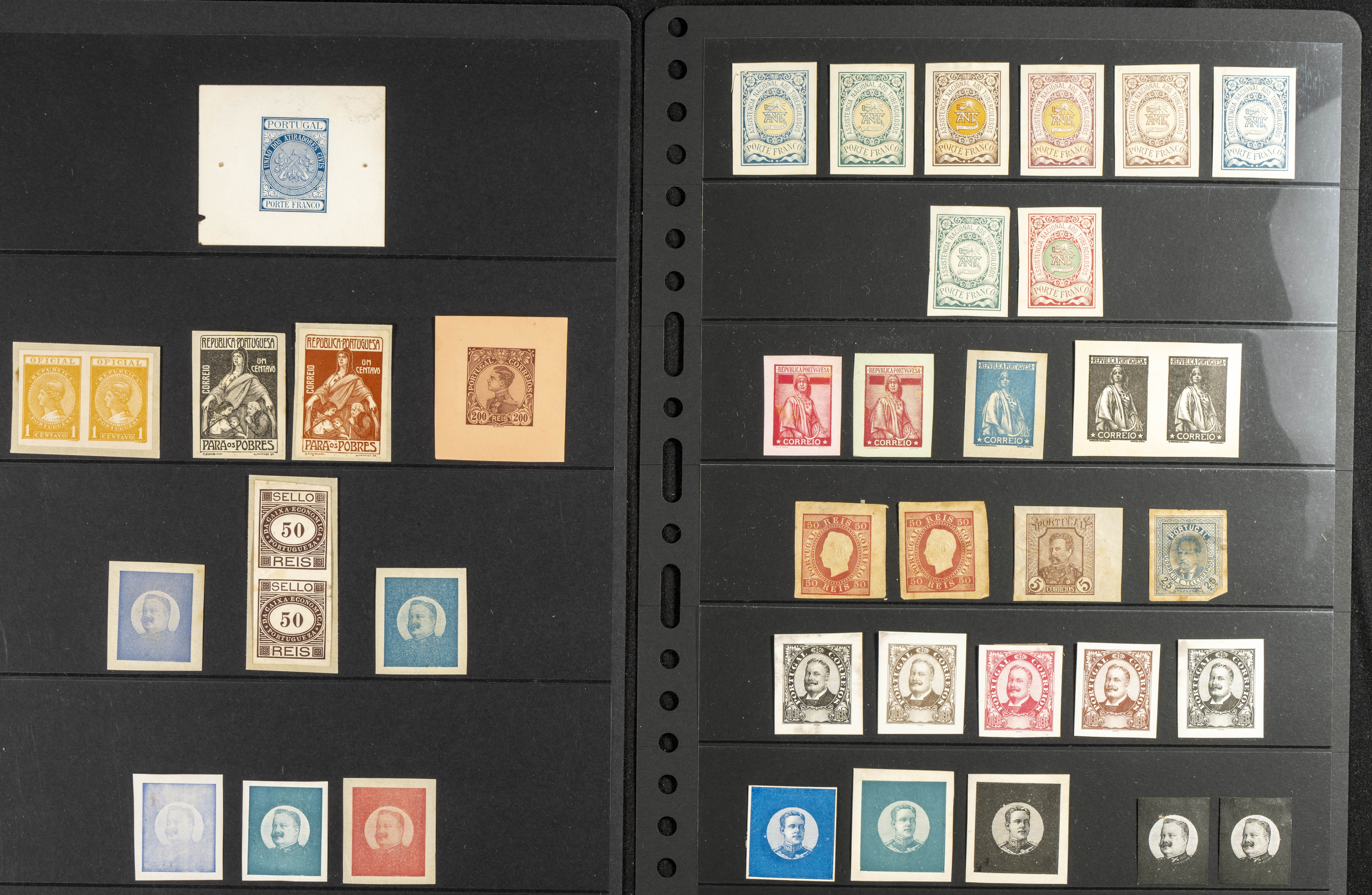 (★)(1870ca). Interesante conjunto de varias decenas de Pruebas y Ensayos de Portugal, la mayoría comprendidos entre 1870 y 1910 e incluyendo proyectos no adoptados de Don Luis I, Don Carlos I y Don Manuel II. IMPRESCINDIBLE EXAMINAR.