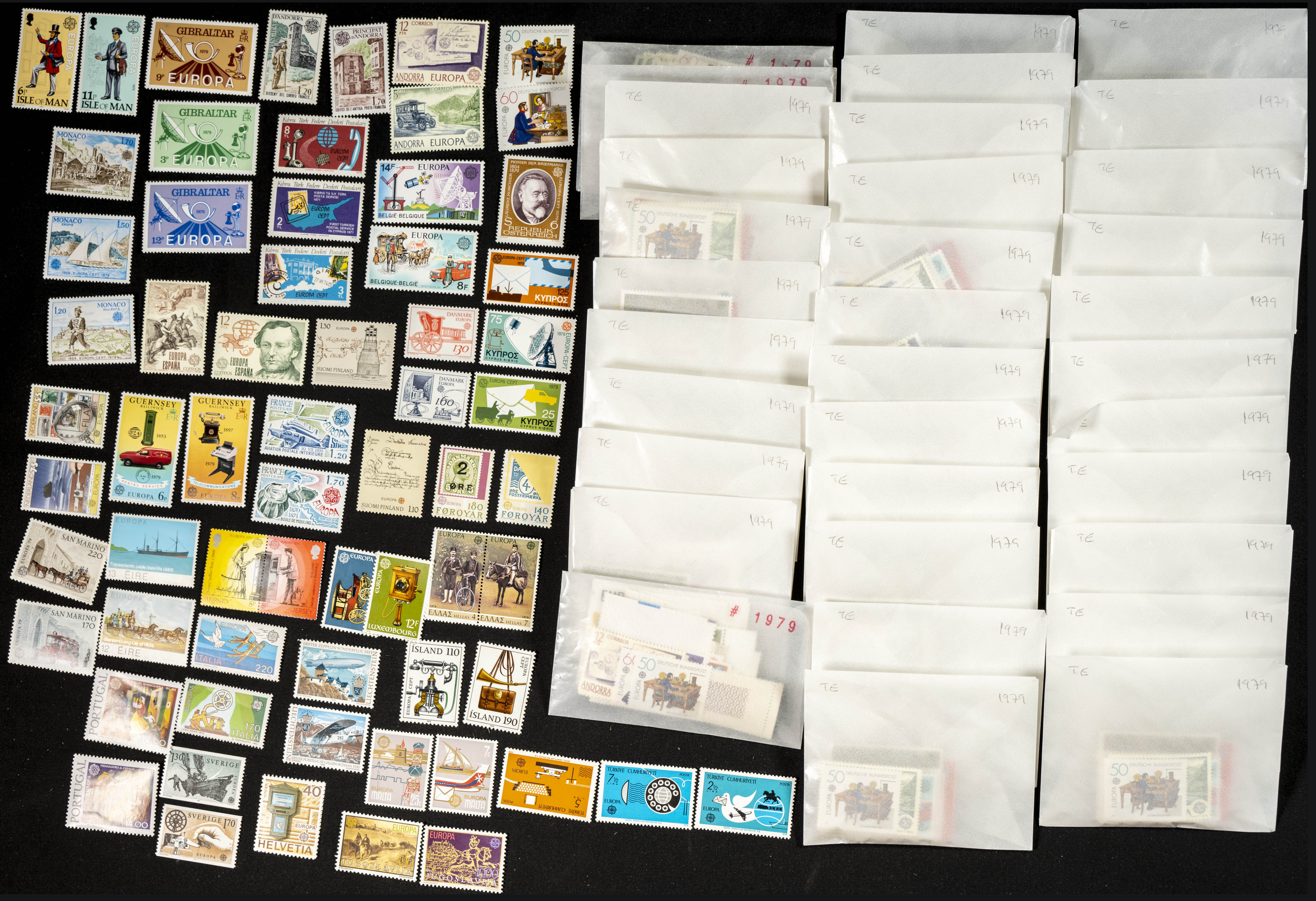★★1979. Conjunto de treinta y cinco años completos del Tema Europa 1979 sin hojas bloque (sólo sellos) organizados en sobres de cristal, en nuevo. A EXAMINAR. Yvert 2016: 3.885 Euros