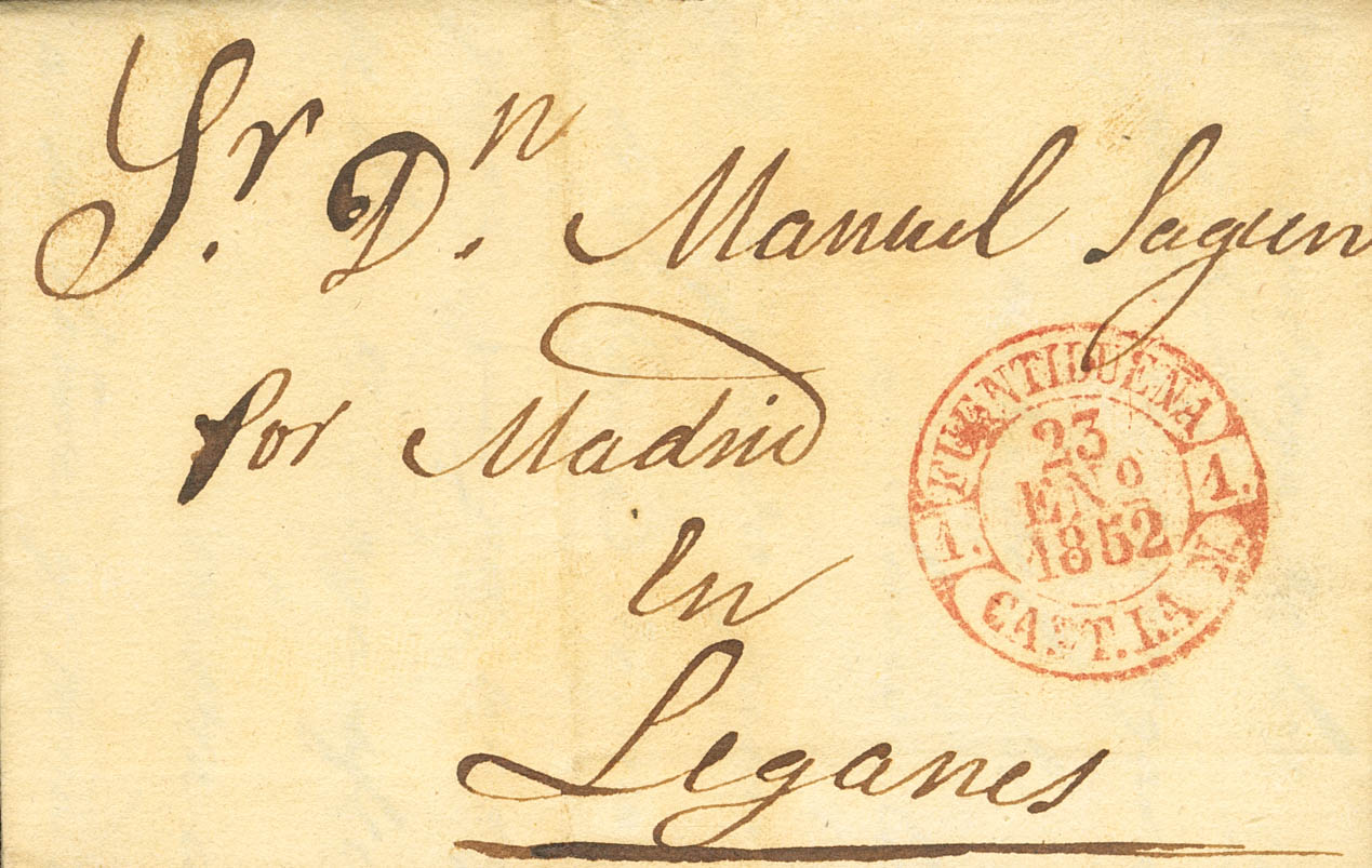 1852. FUENTIDUEÑA DEL TAJO (MADRID) a LEGANES. Baeza FUENTIDUEÑA / CAST.LA N. MAGNIFICA Y MUY RARA.
