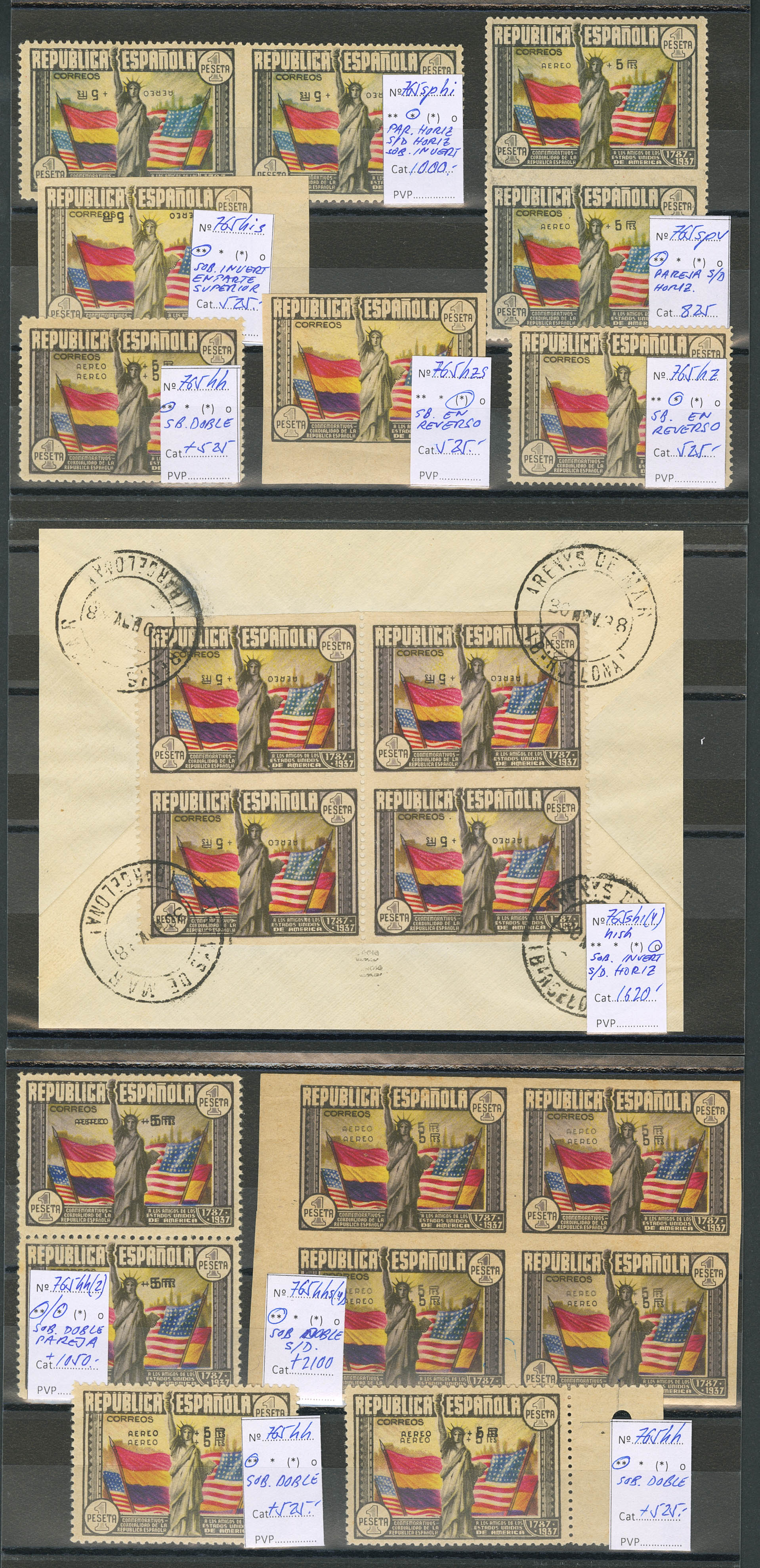 ★★/★1938. Interesante conjunto de variedades del sello sobrecargado AEREO+5 PTS de Constitución de los Estados Unidos, incluye varios tipos de sobrecargas dobles, dentados y sin dentar, invertidas, impresas en el reverso, calcadas, variedades de dentado (muy buena calidad en general, la mayoría sin fijasellos). MAGNIFICO Y RARO CONJUNTO. (varios certificados) Edifil 2020: 9.745 Euros