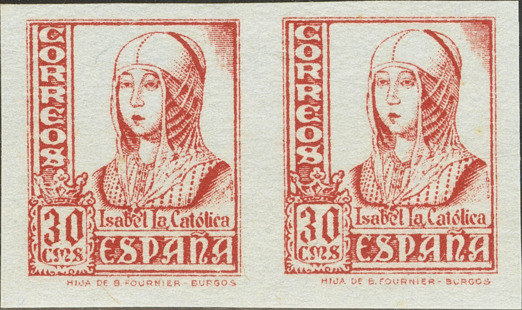 (★) 823P(2). 1937. 30 cts rosa, pareja. ENSAYO DE COLOR y SIN DENTAR, sobre cartulina azulada. MAGNIFICA.