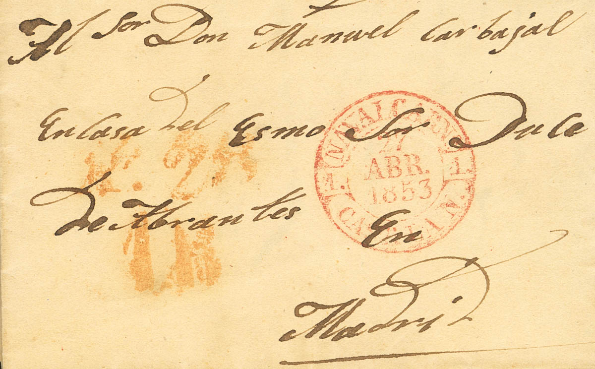 1853. NAVALCARNERO a MADRID. Baeza NAVALCARNº / CAST.LA N., en rojo. MAGNIFICA.
