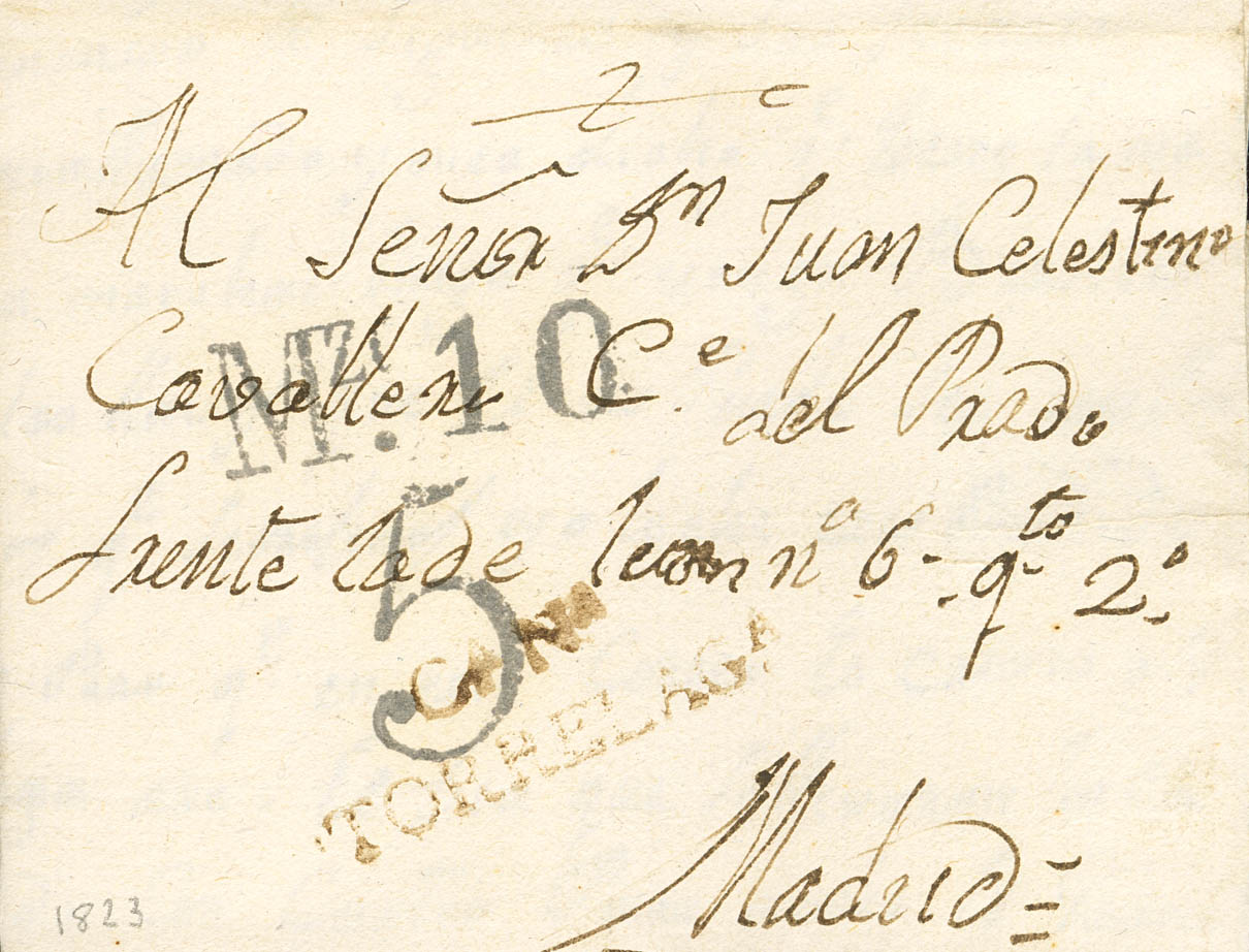 1823. TORRELAGUNA a MADRID. Madrid Cª Nª / TORRELAGA, en tinta de escribir (P.E.2) edición 2004.