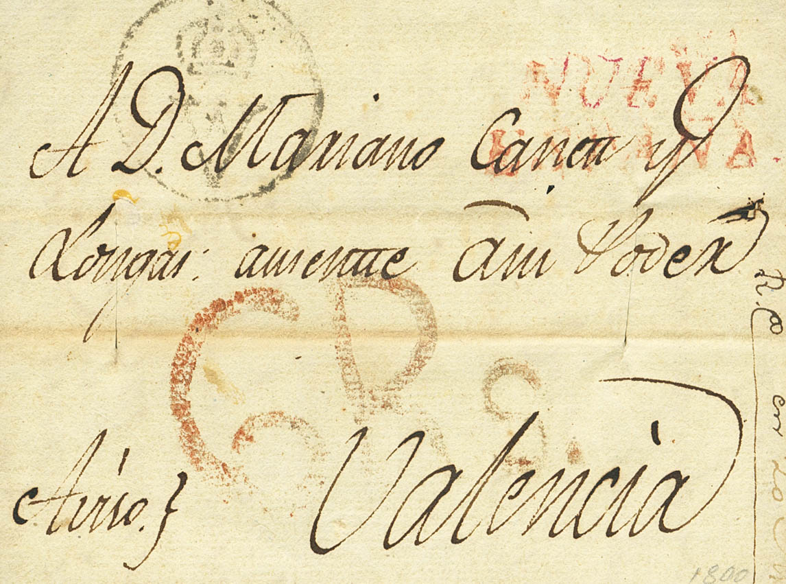 1800. VERACRUZ (MEJICO) a VALENCIA, carta desinfectada. Marca NUEVA / ESPAÑA, en rojo de Veracruz (P.E.10) edición 2004 y V "CORONADA", en negro de Valencia aplicada habitualmente como marca de llegada (P.E.38). MAGNIFICA Y RARA, CIRCULADA DURANTE EL PERIODO COLONIAL. Ex-Antonio Cuesta.