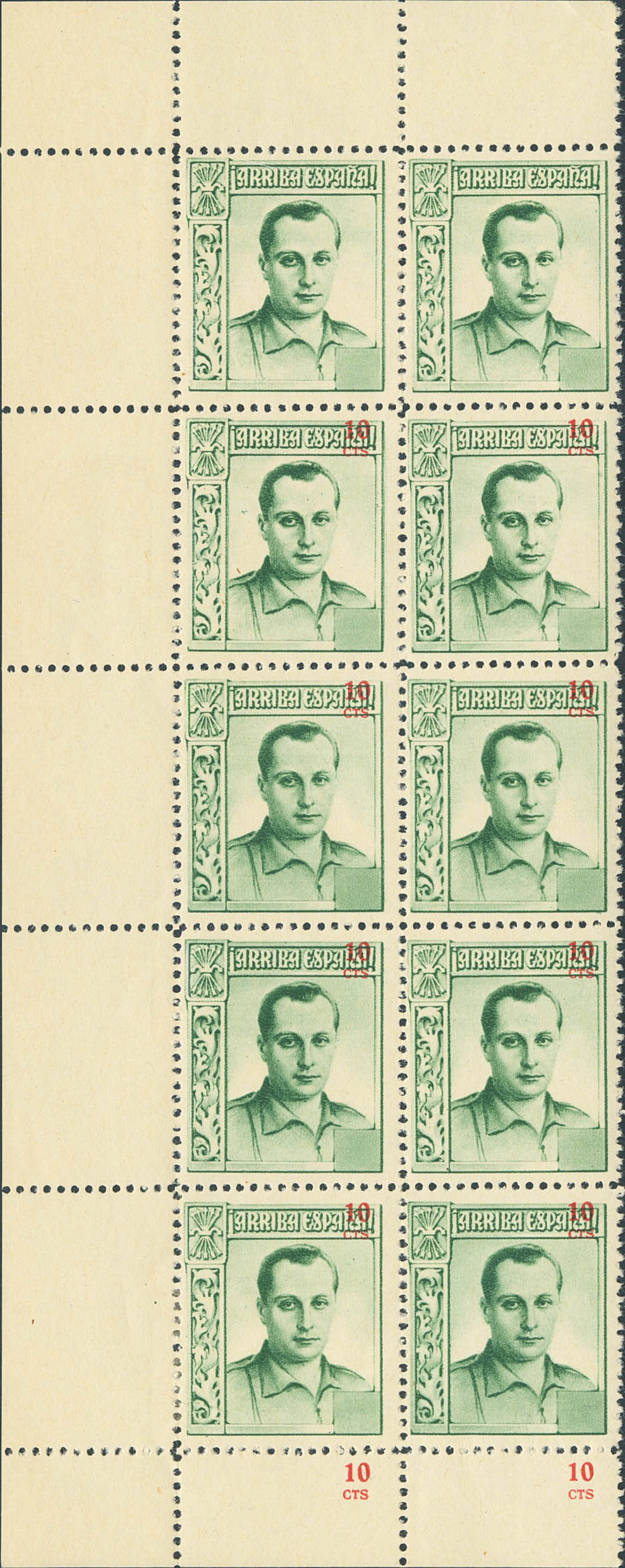 ★★/★ NE15(10). 1936. 10 cts verde y rojo, bloque de diez. CIFRA DEL VALOR DESPLAZADA, DEJANDO DOS SELLOS CON VALOR OMITIDO. MAGNIFICO.