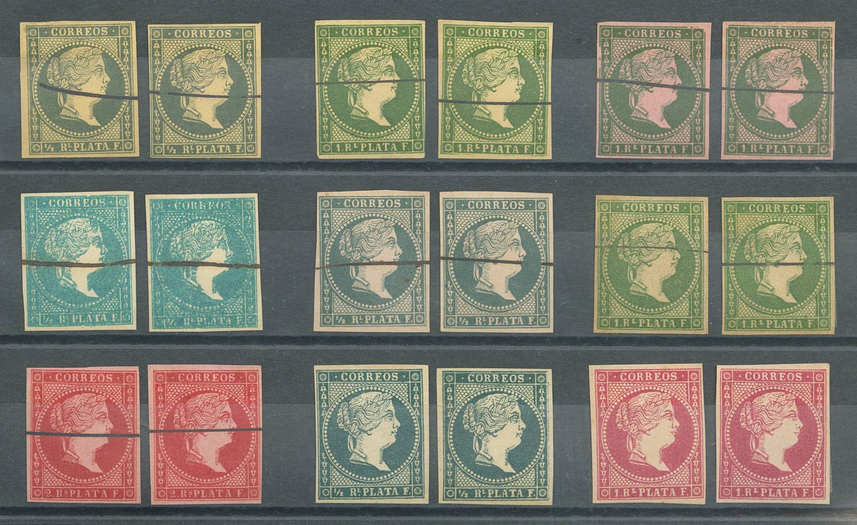 ★/(★) 7P, 8P. 1857. Conjunto de dieciocho ENSAYOS DE COLOR de ½ real y 1 real de 1857, la mayoría con trazos de tinta. MAGNIFICOS.