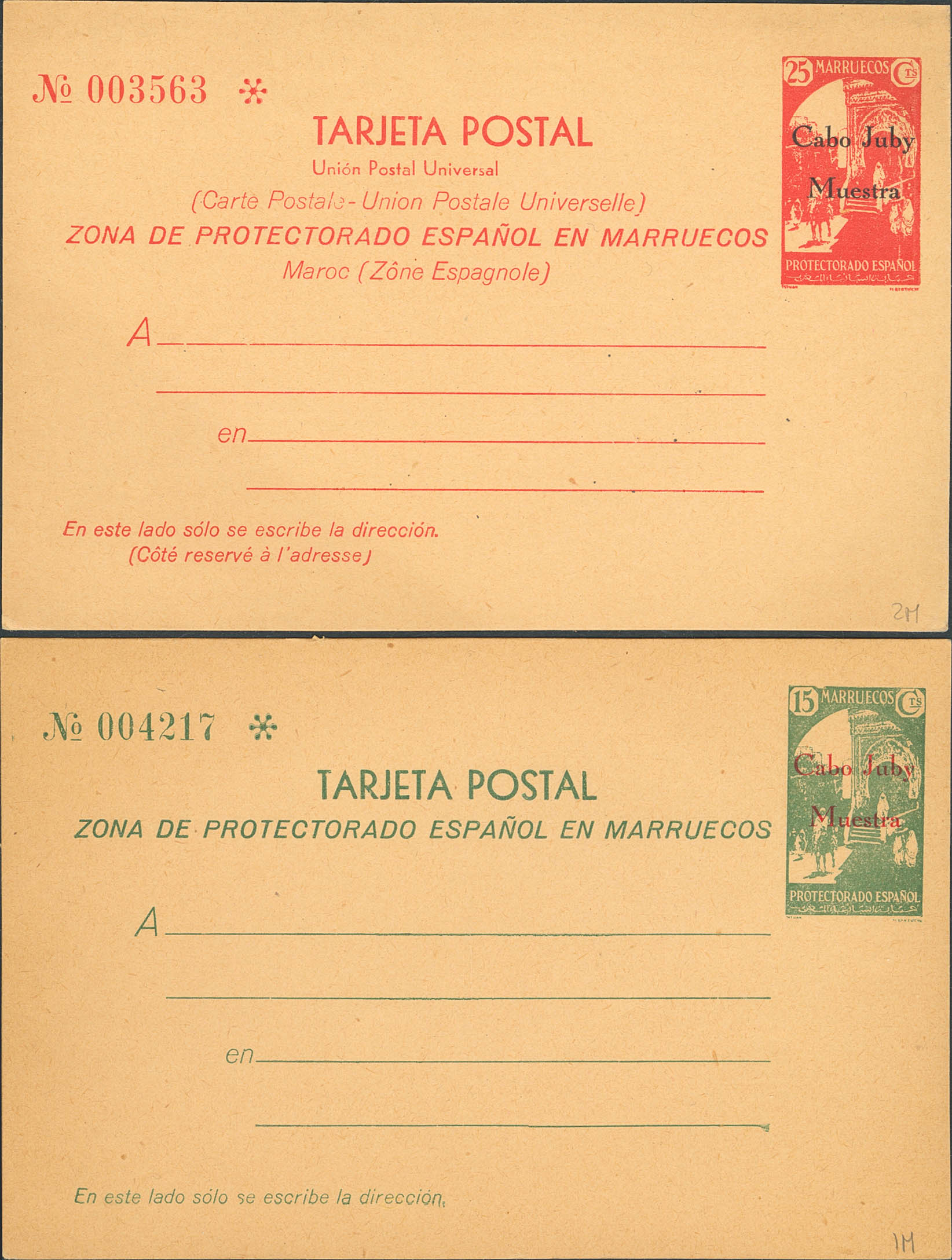 (★) EP1/2M. 1934. 15 cts verde y 25 cts rojo sobre Tarjetas Entero Postales. MUESTRA. MAGNIFICAS Y RARAS. Edifil 2018: 810 Euros