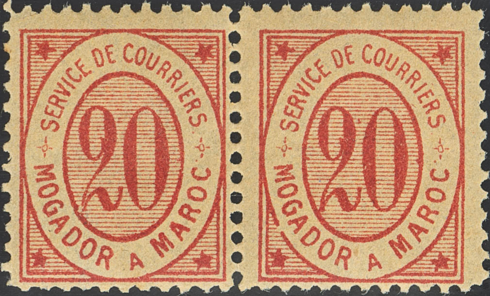 ★ 83(2). 1892. 20 cts rojo, pareja. MUGADOR A MAROC. MAGNIFICA. Edifil 2025: 60 Euros