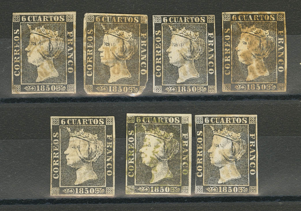 1(5), 1A(2). 1850. Conjunto de siete sellos del 6 cuartos negro (Tipo I y II) inutilizados con el matasello baeza VILLAGARCIA / GALICIA, en verde aceitoso (característico de Villagarcía). MAGNIFICO Y RARO. Dictamen GRAUS (dos sellos).