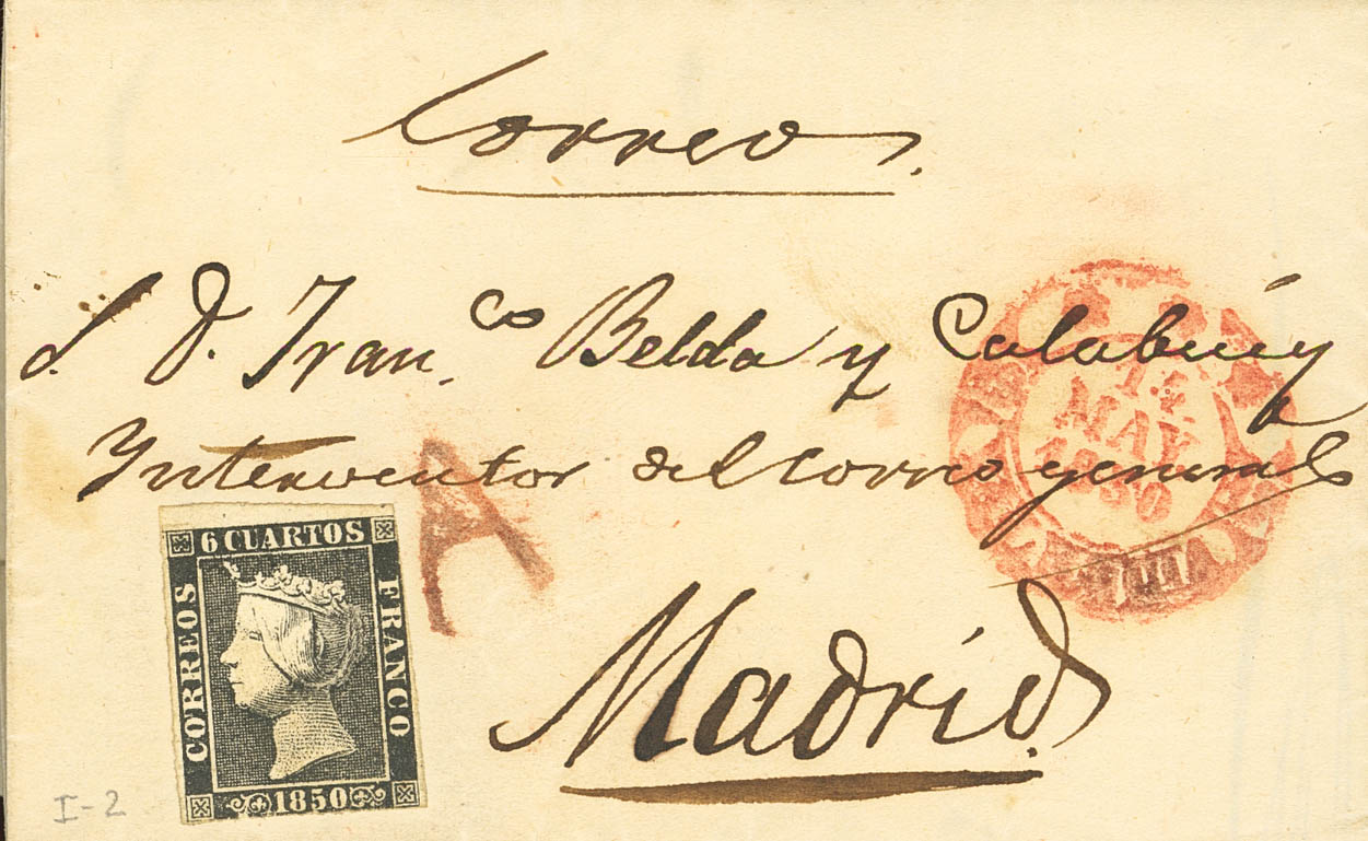 1. 1850. 6 cuartos negro (sello sin inutilizar). VALENCIA a MADRID. En el frente marca de abono "A", en rojo de Valencia. A EXAMINAR.