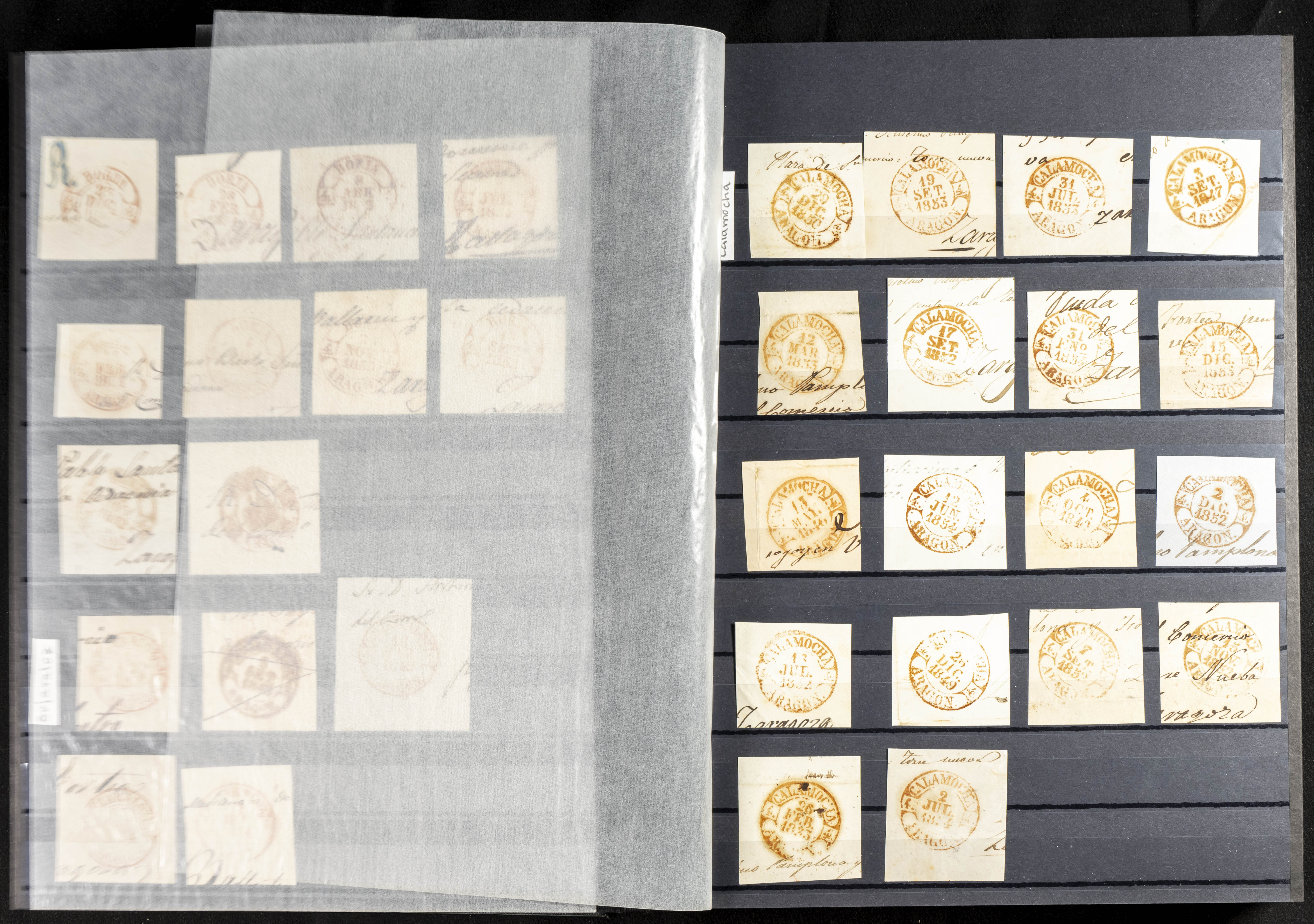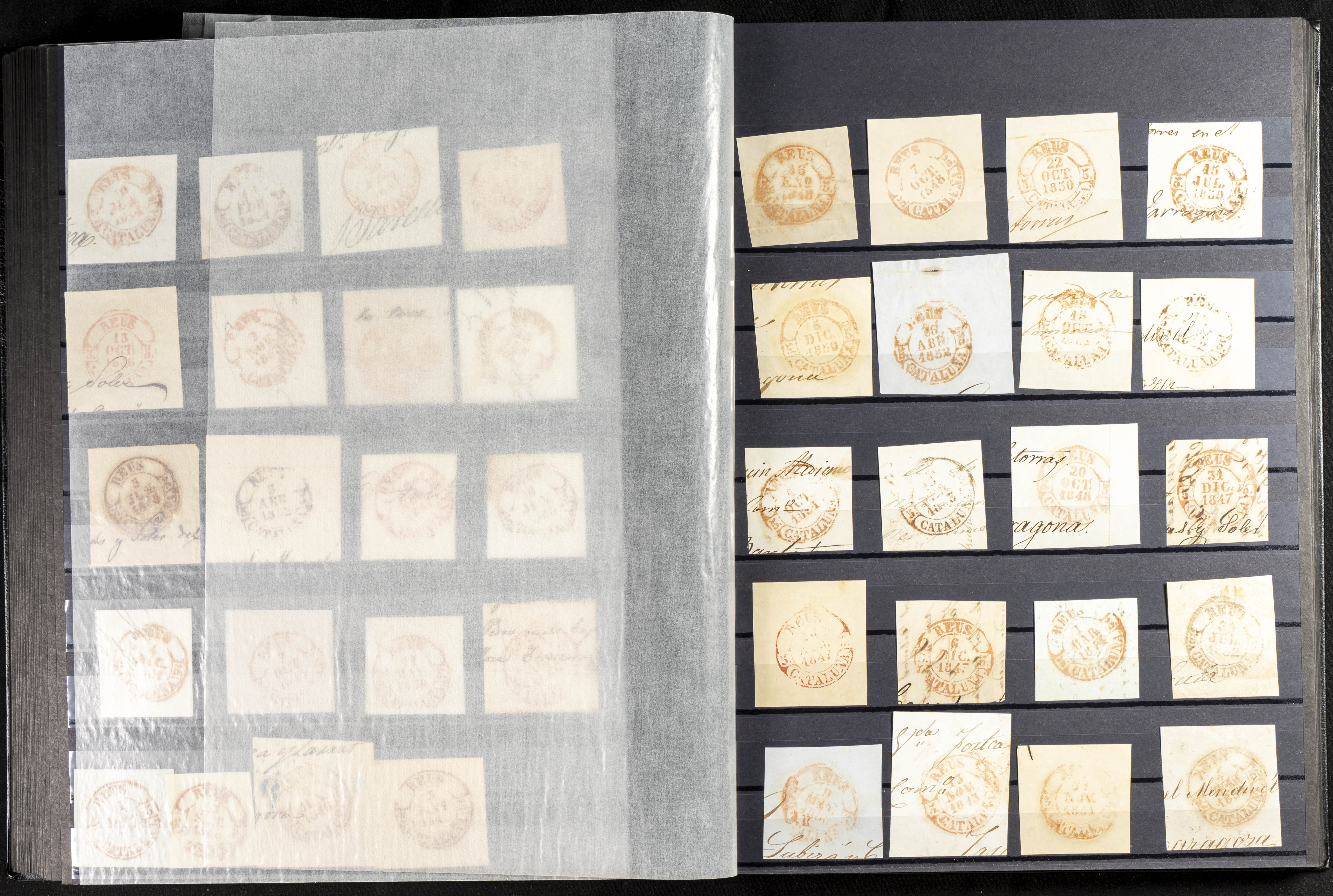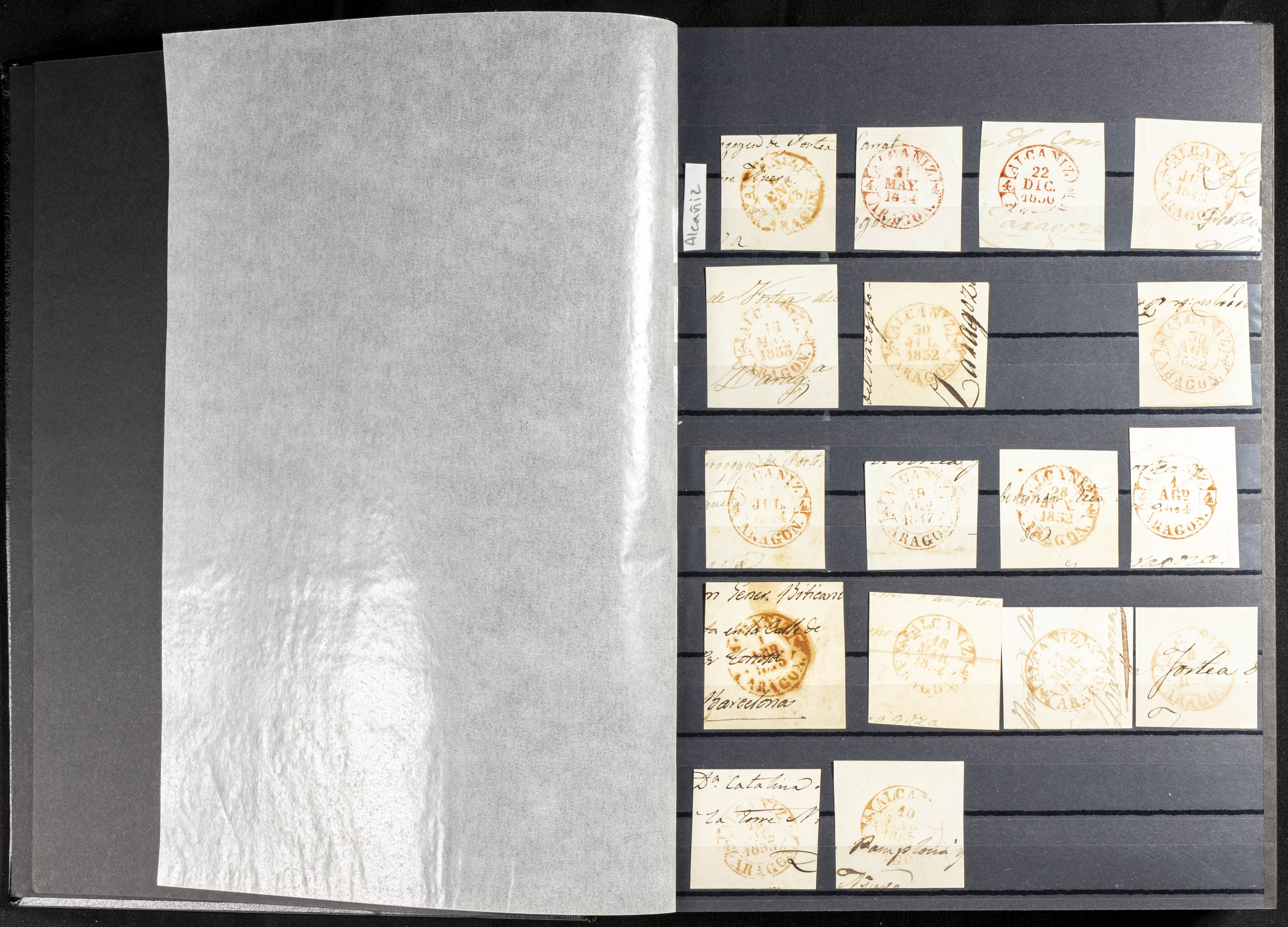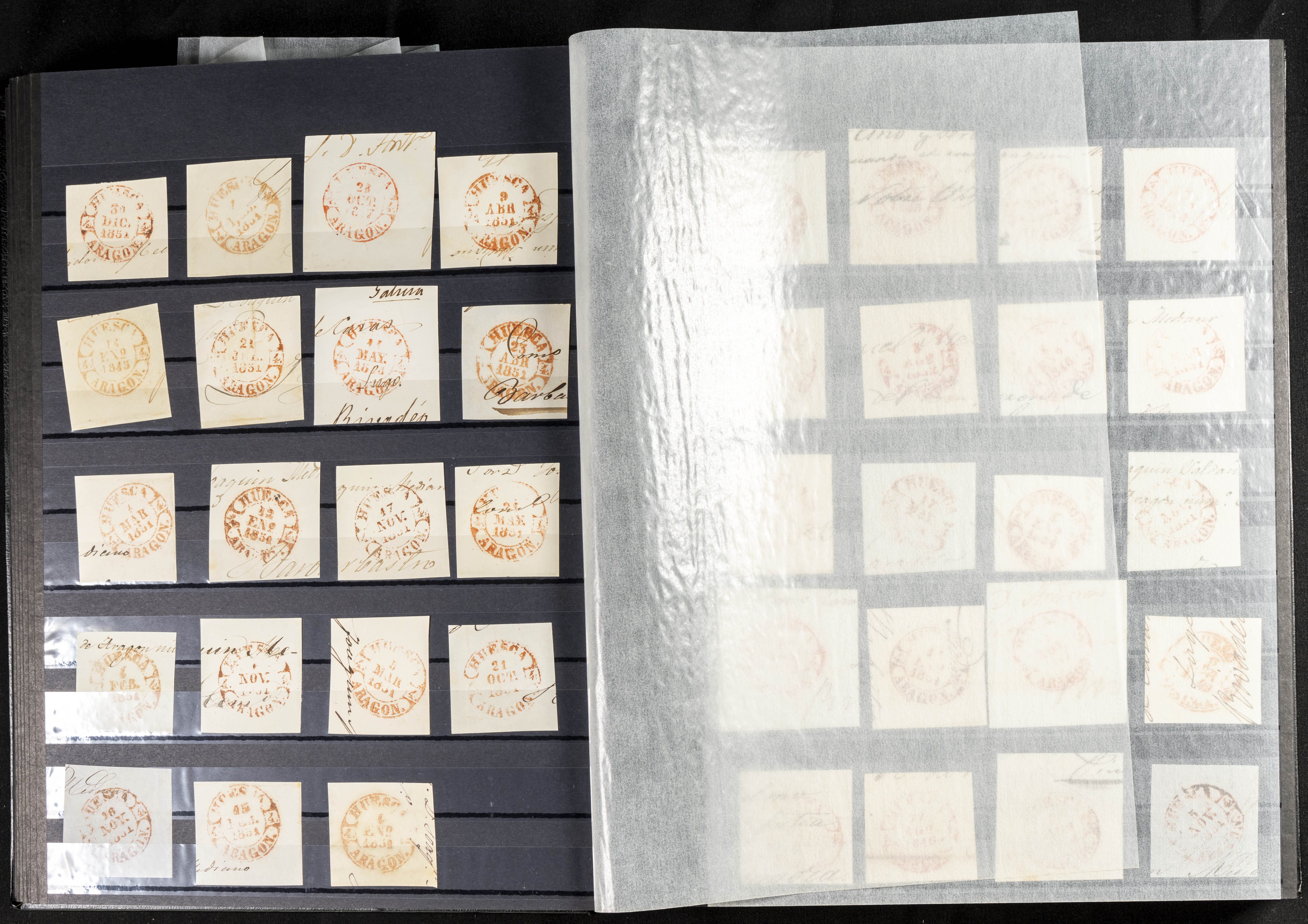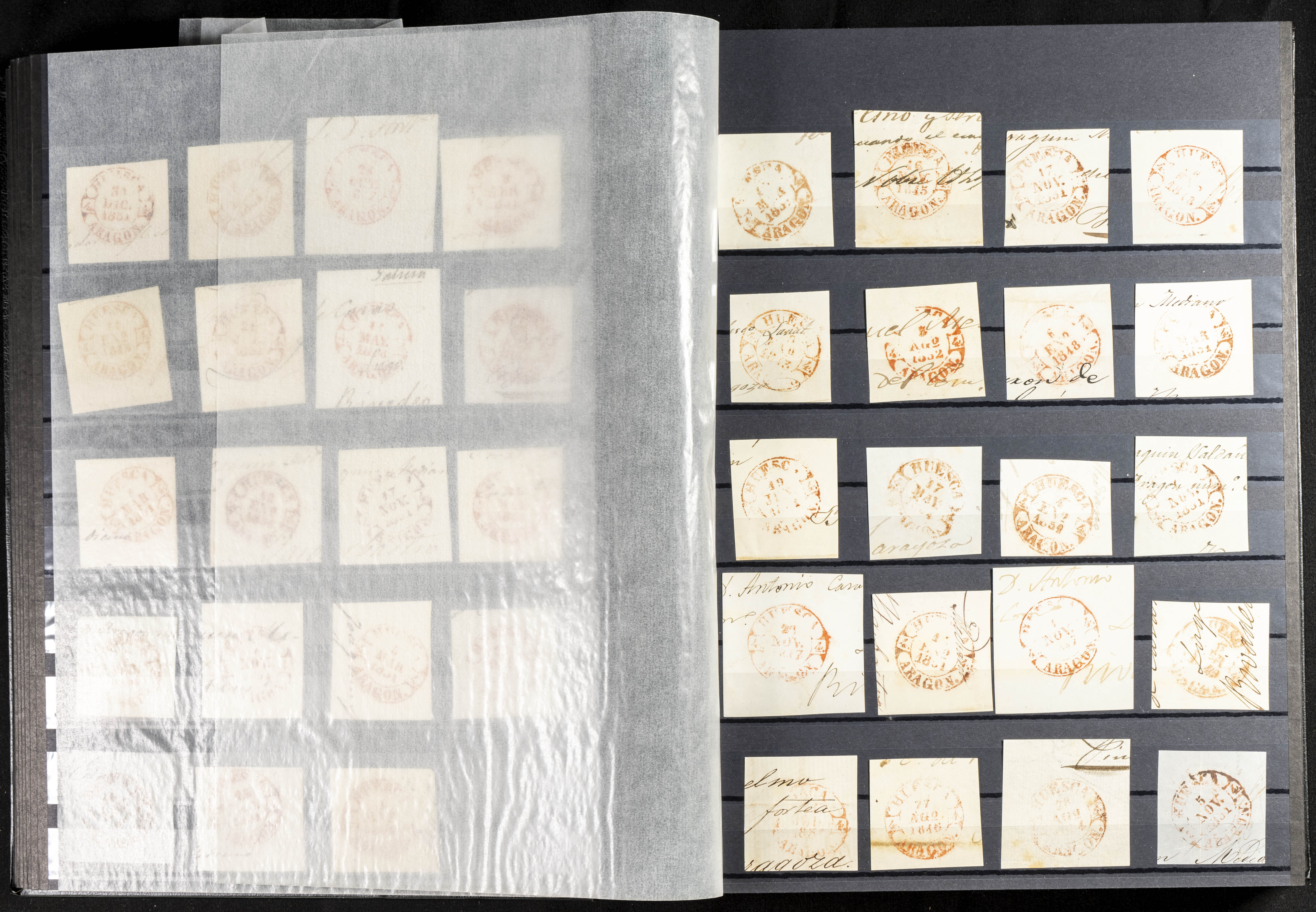 (1850ca). Estudio de referencia de Pedro Monge con más de mil cuatrocientos fragmentos recortados de fechadores originales tipo "baeza" de las demarcaciones postales de Aragón y Cataluña, muchos de gran calidad e incluyendo algunos baezas de Madrid capital. A EXAMINAR.