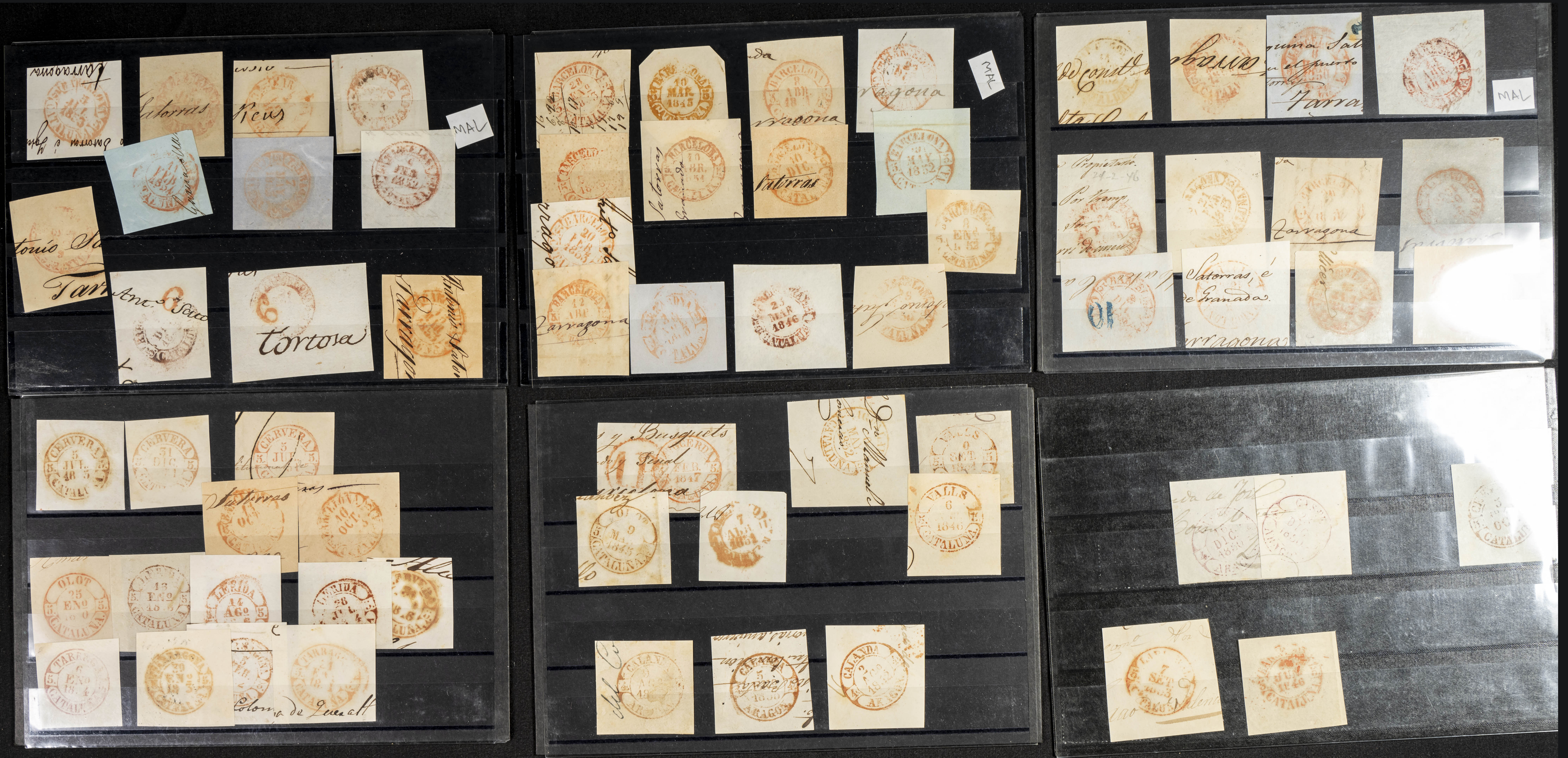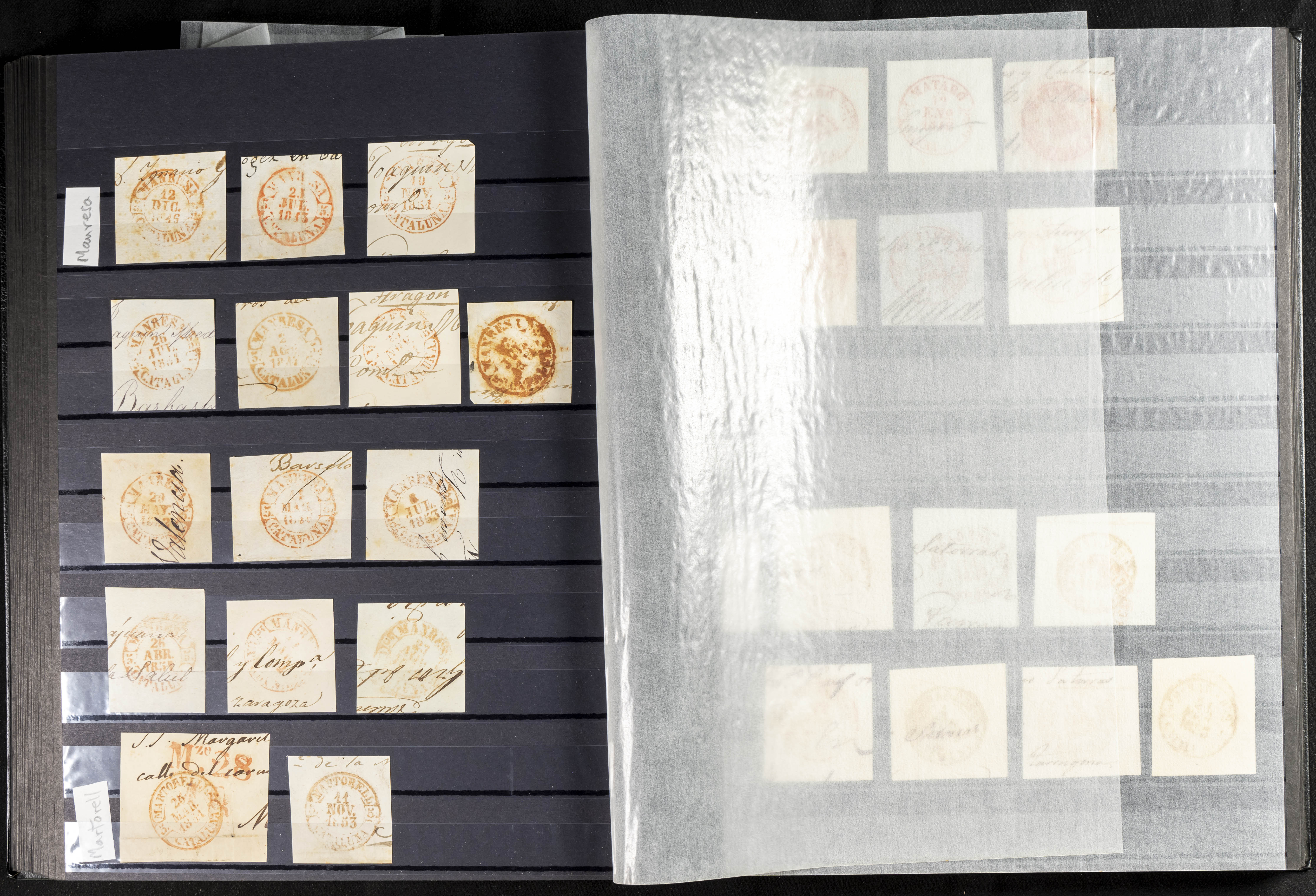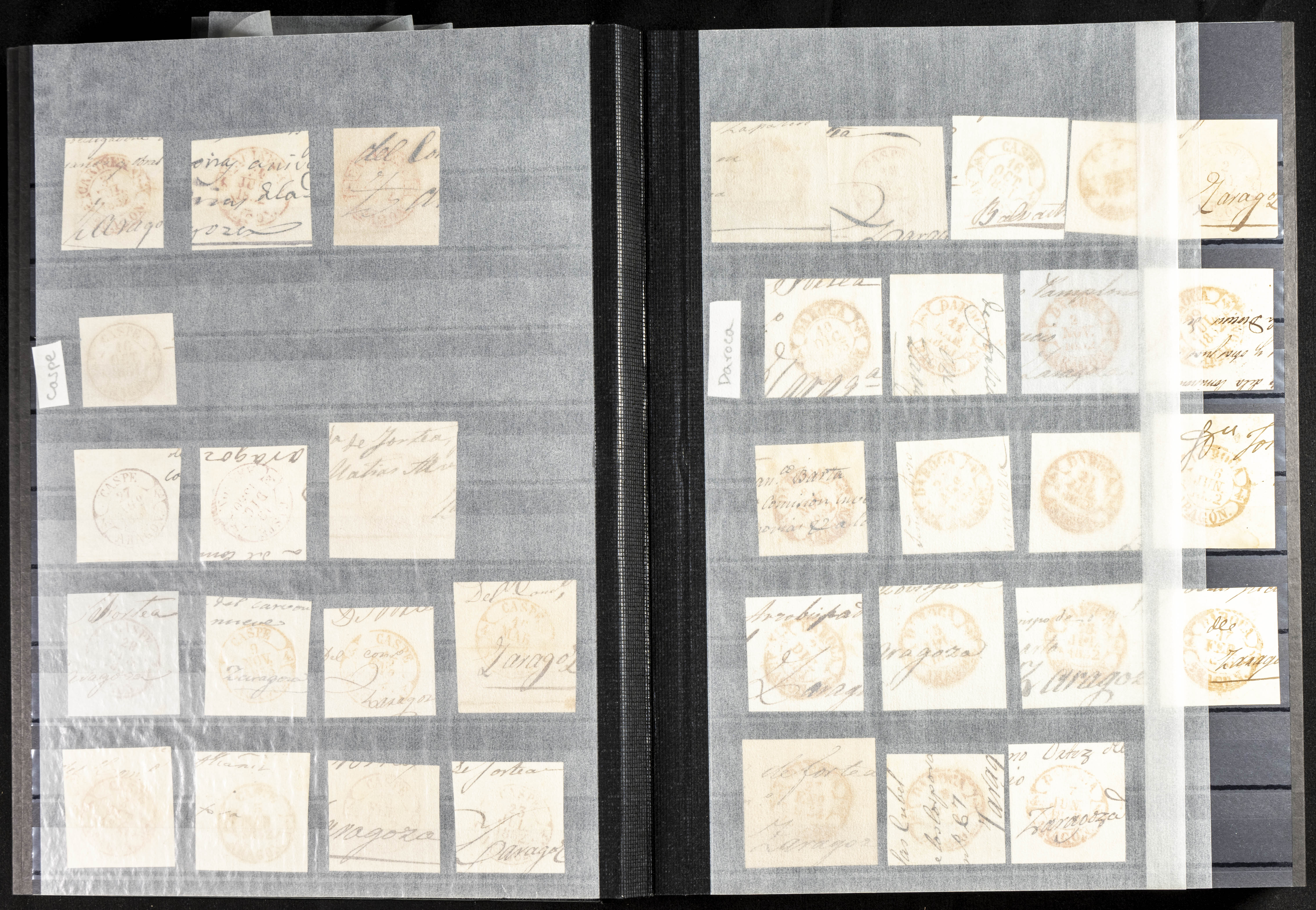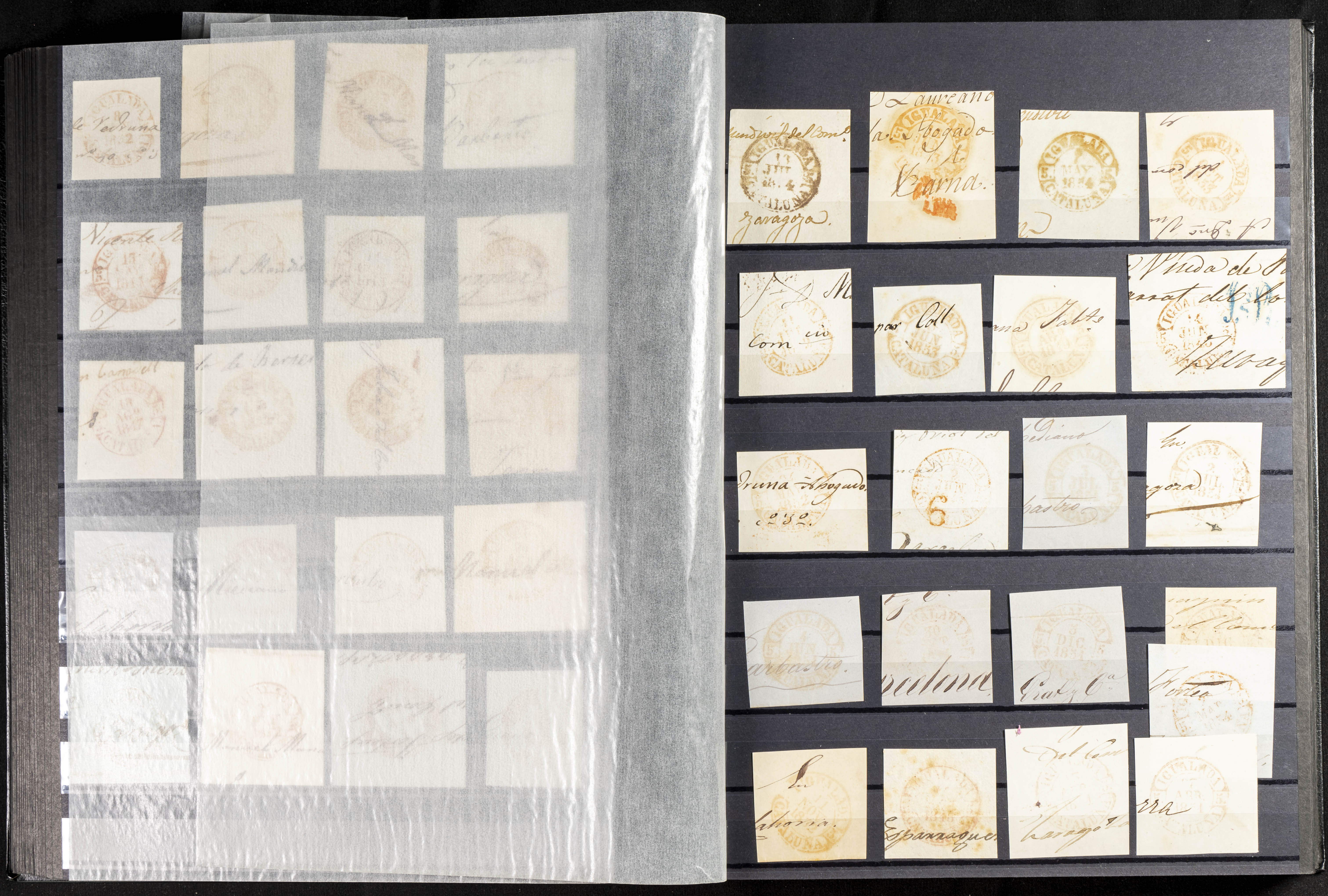 (1850ca). Estudio de referencia de Pedro Monge con más de mil cuatrocientos fragmentos recortados de fechadores originales tipo "baeza" de las demarcaciones postales de Aragón y Cataluña, muchos de gran calidad e incluyendo algunos baezas de Madrid capital. A EXAMINAR.