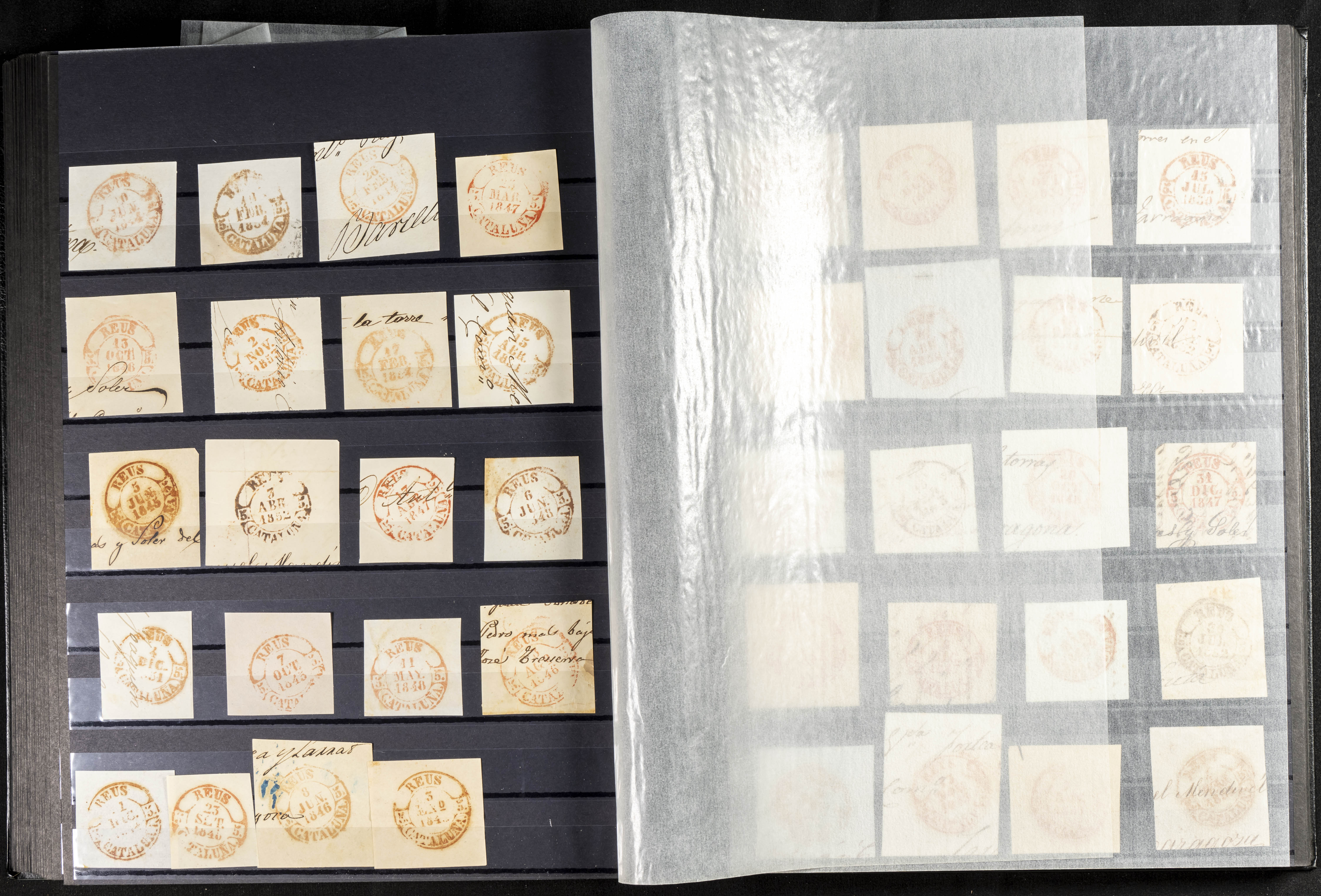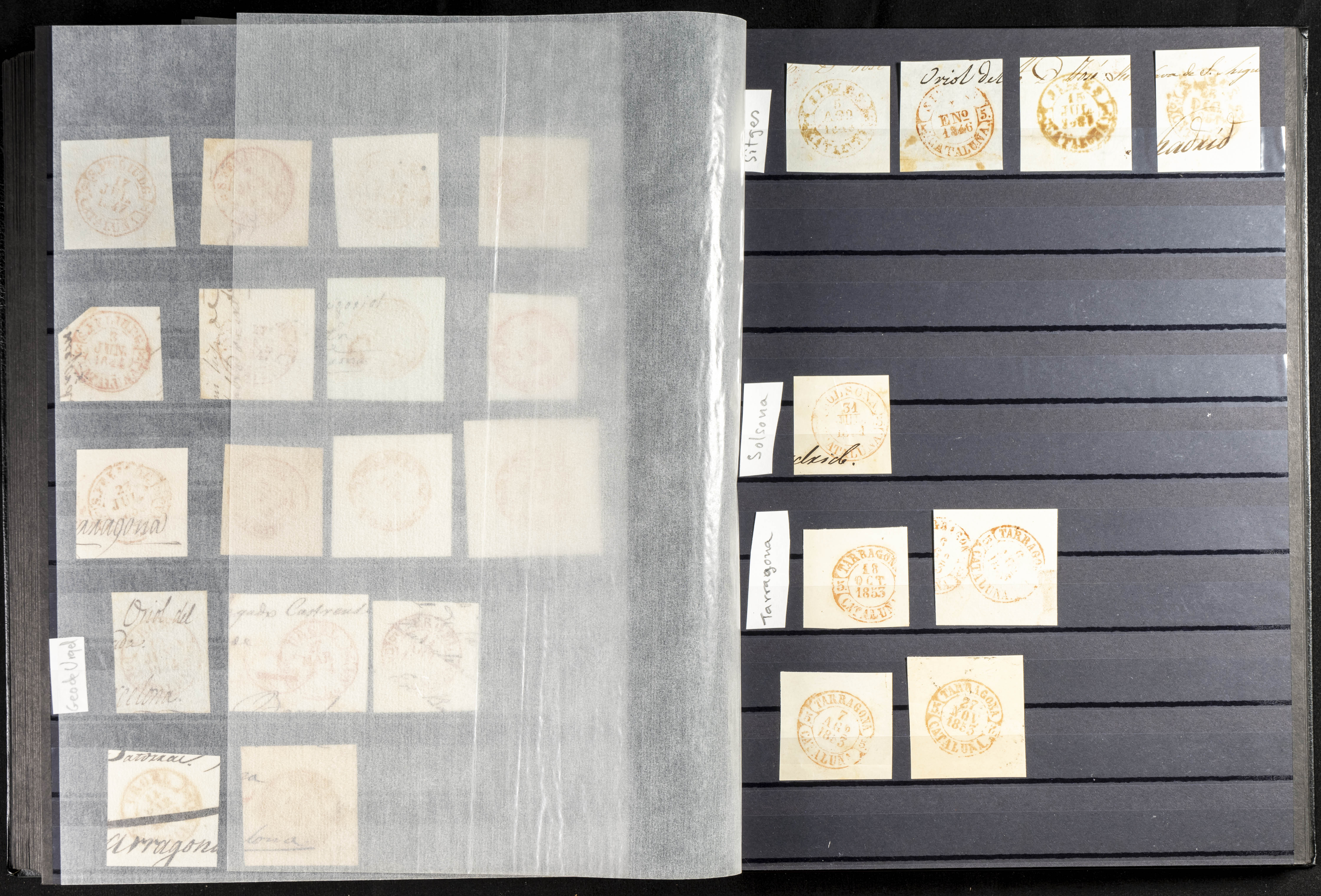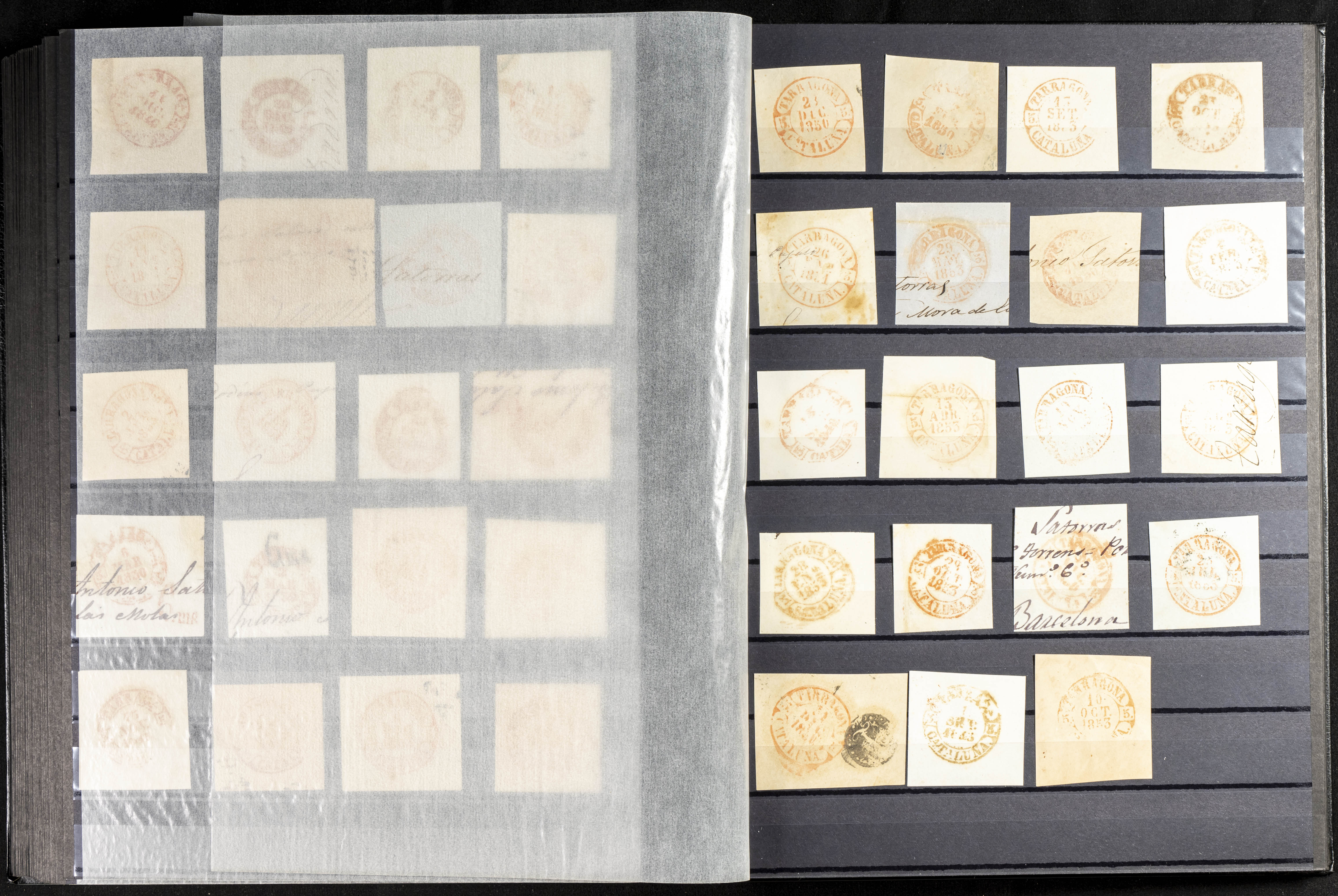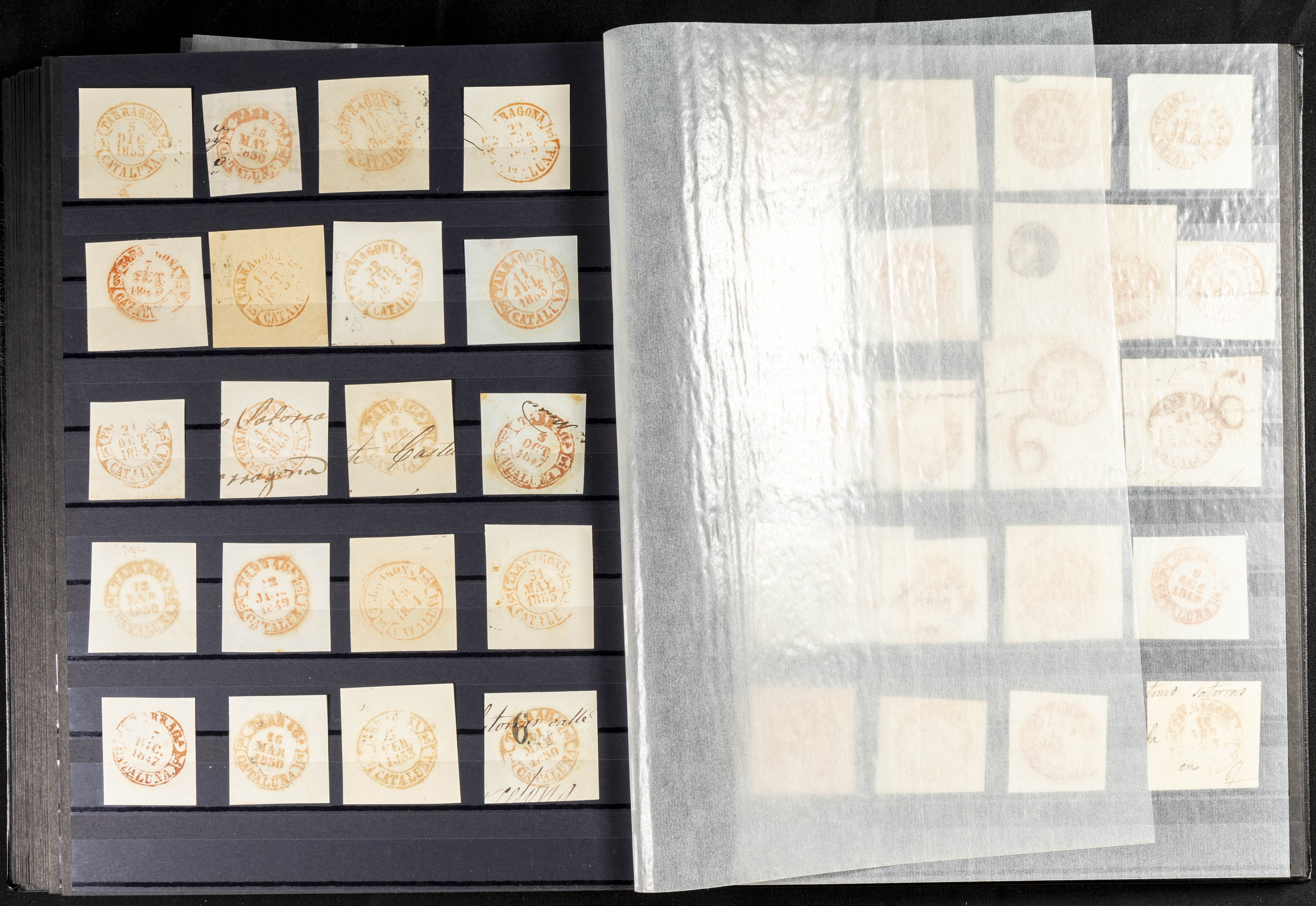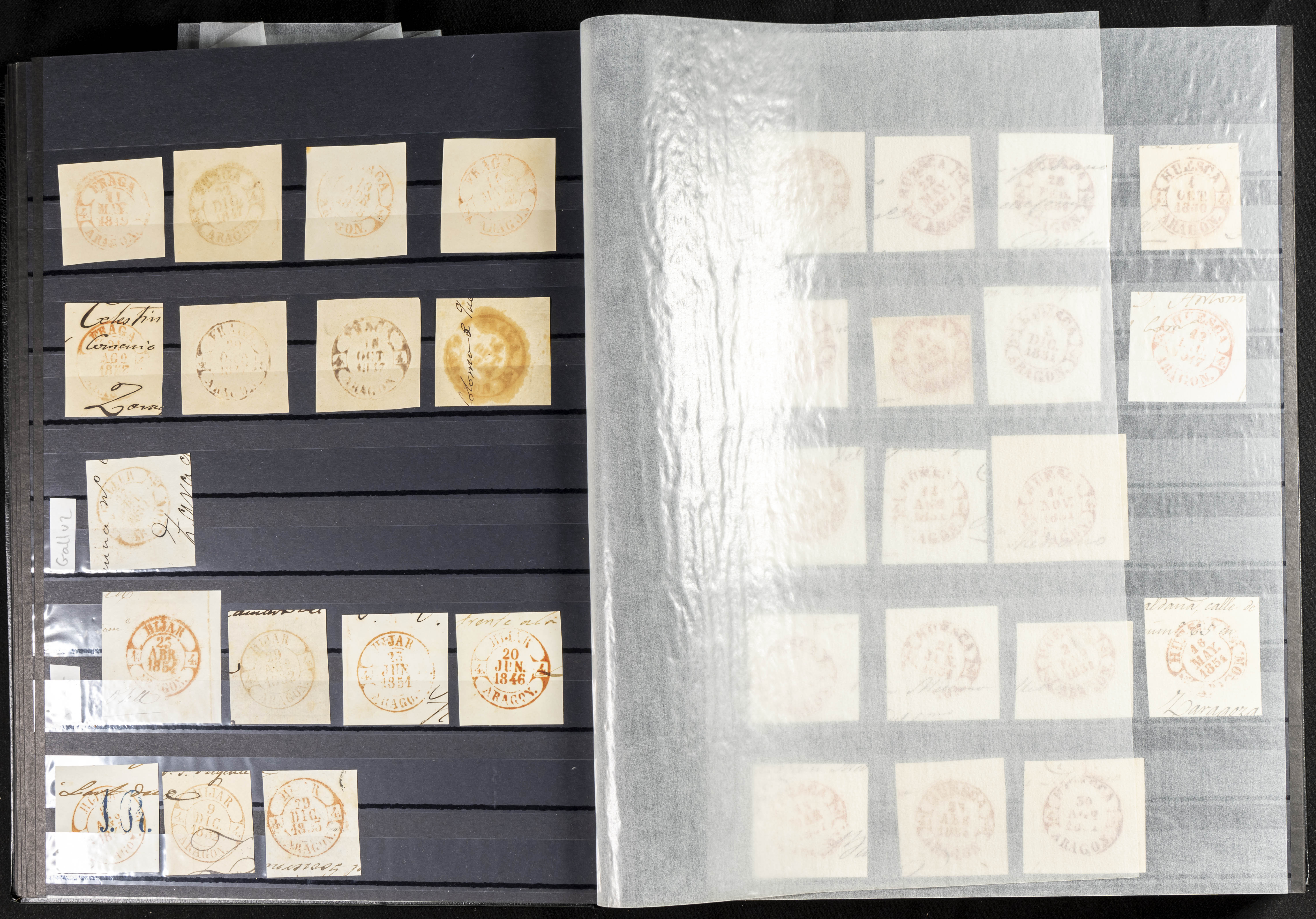 (1850ca). Estudio de referencia de Pedro Monge con más de mil cuatrocientos fragmentos recortados de fechadores originales tipo "baeza" de las demarcaciones postales de Aragón y Cataluña, muchos de gran calidad e incluyendo algunos baezas de Madrid capital. A EXAMINAR.
