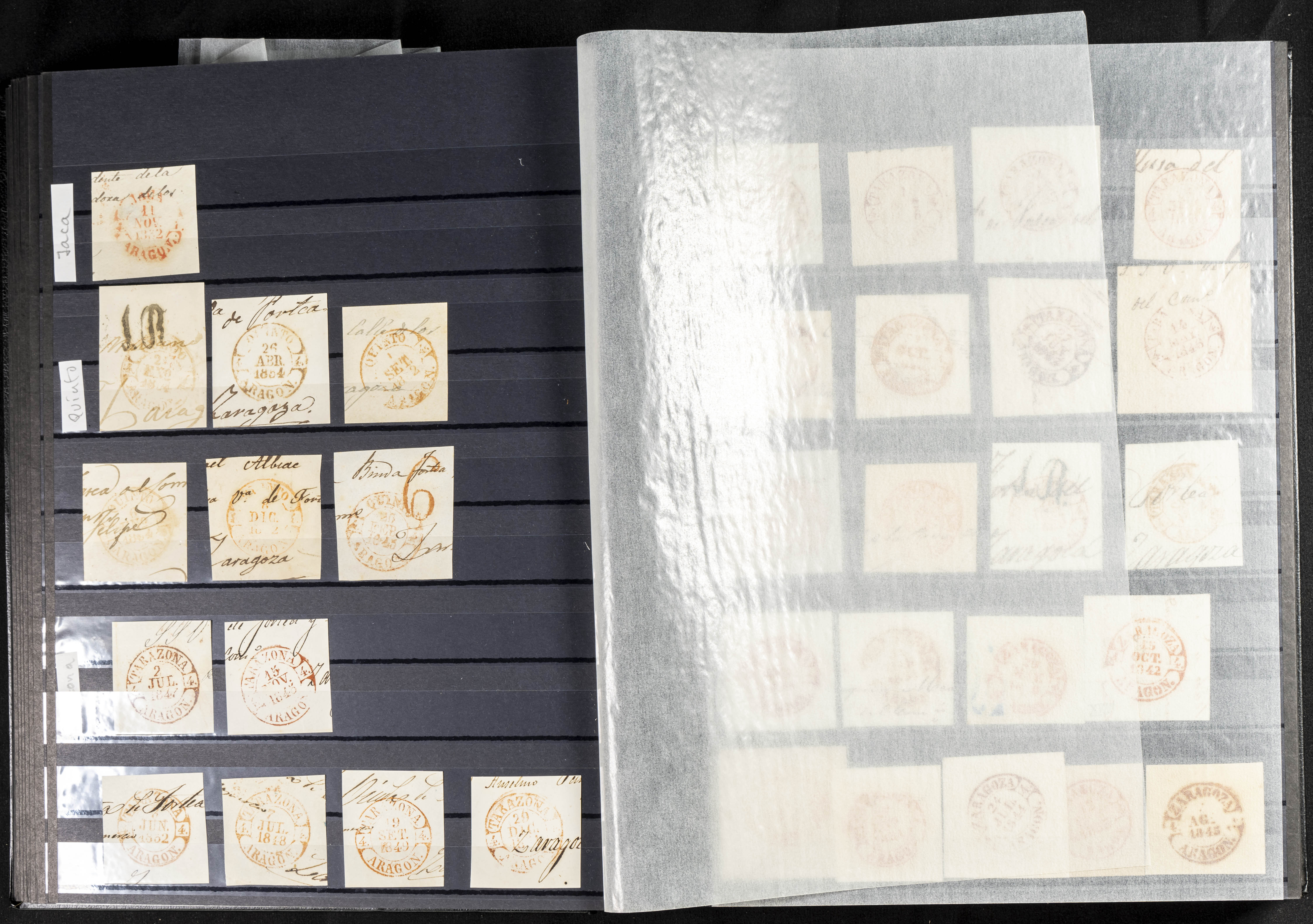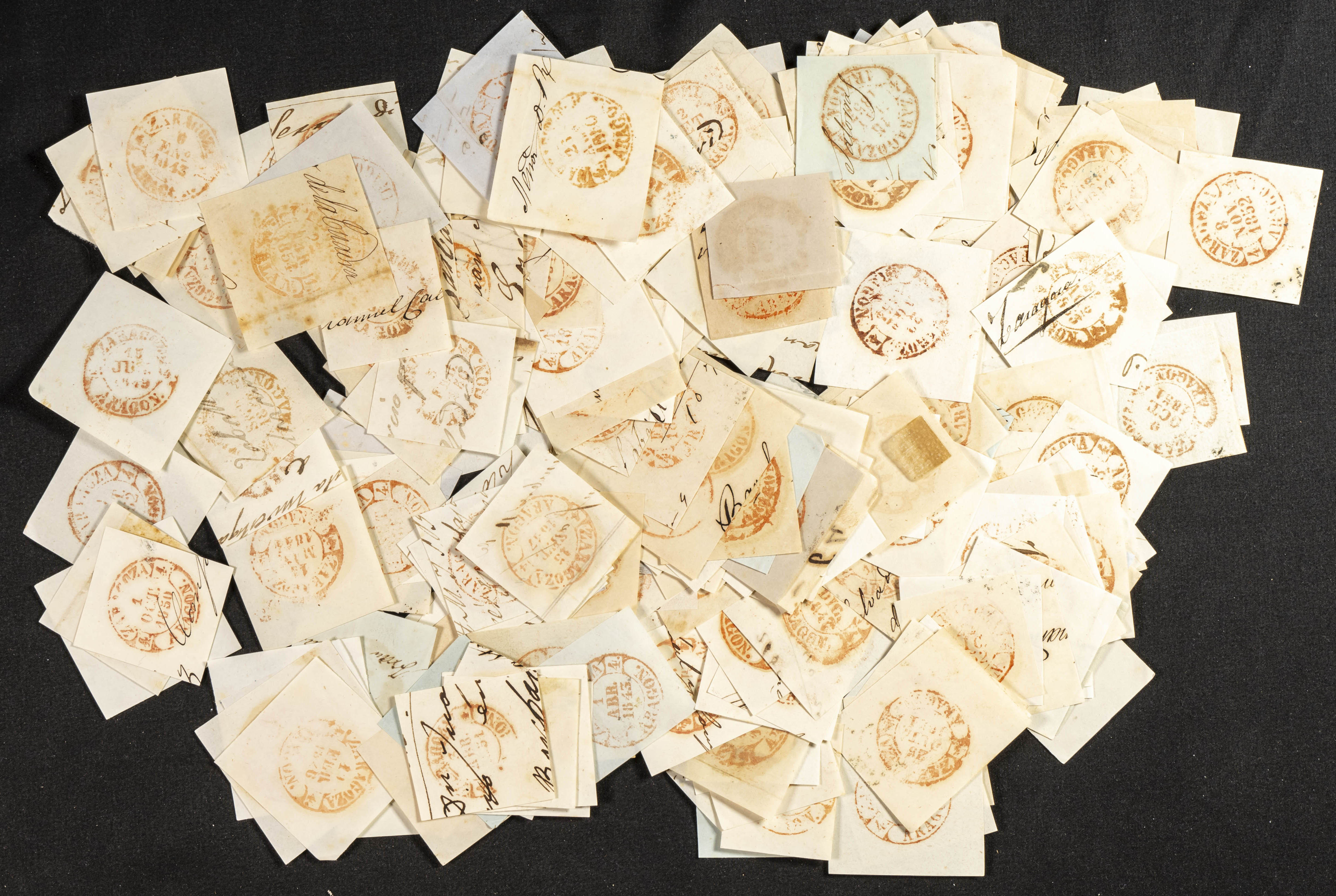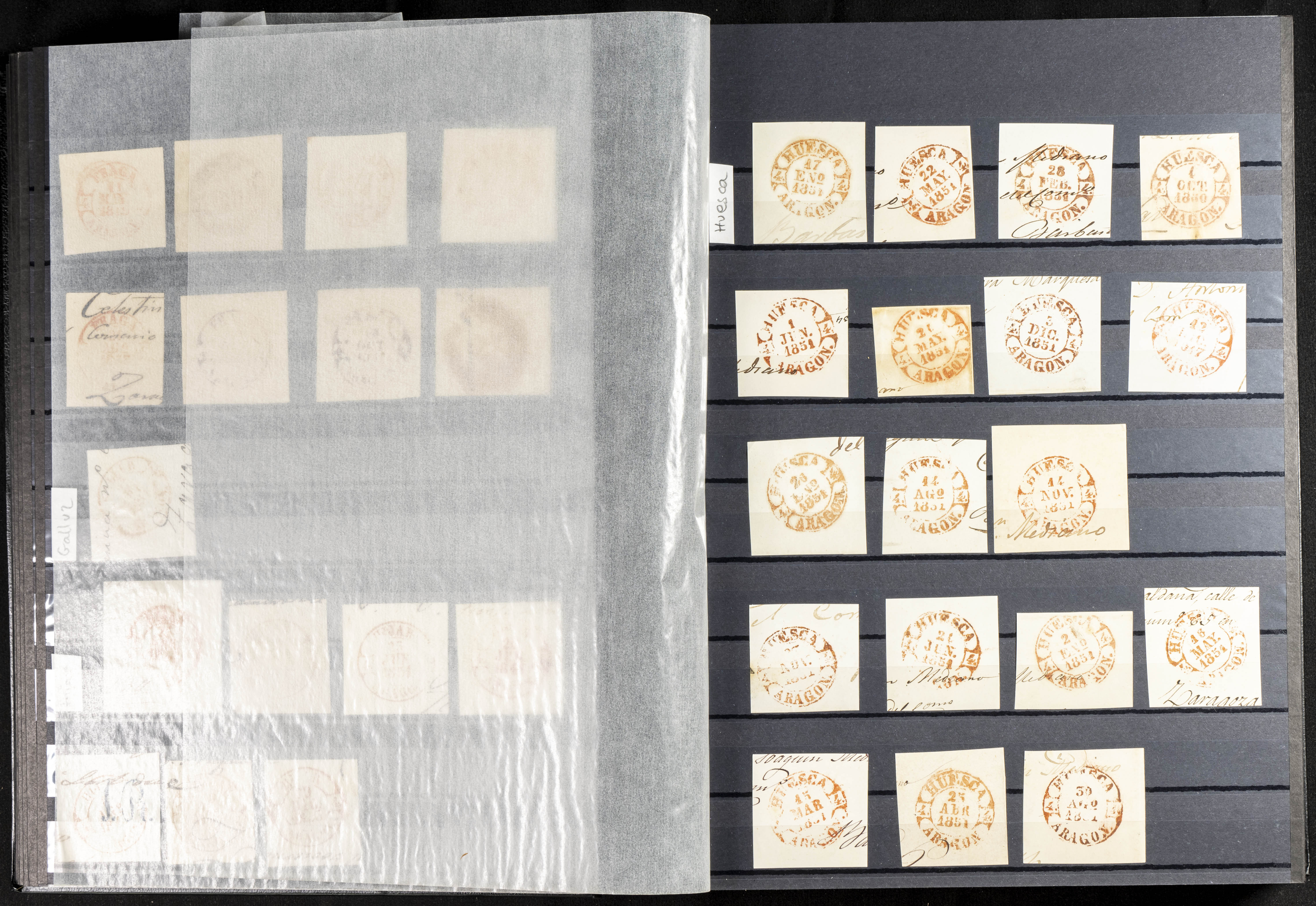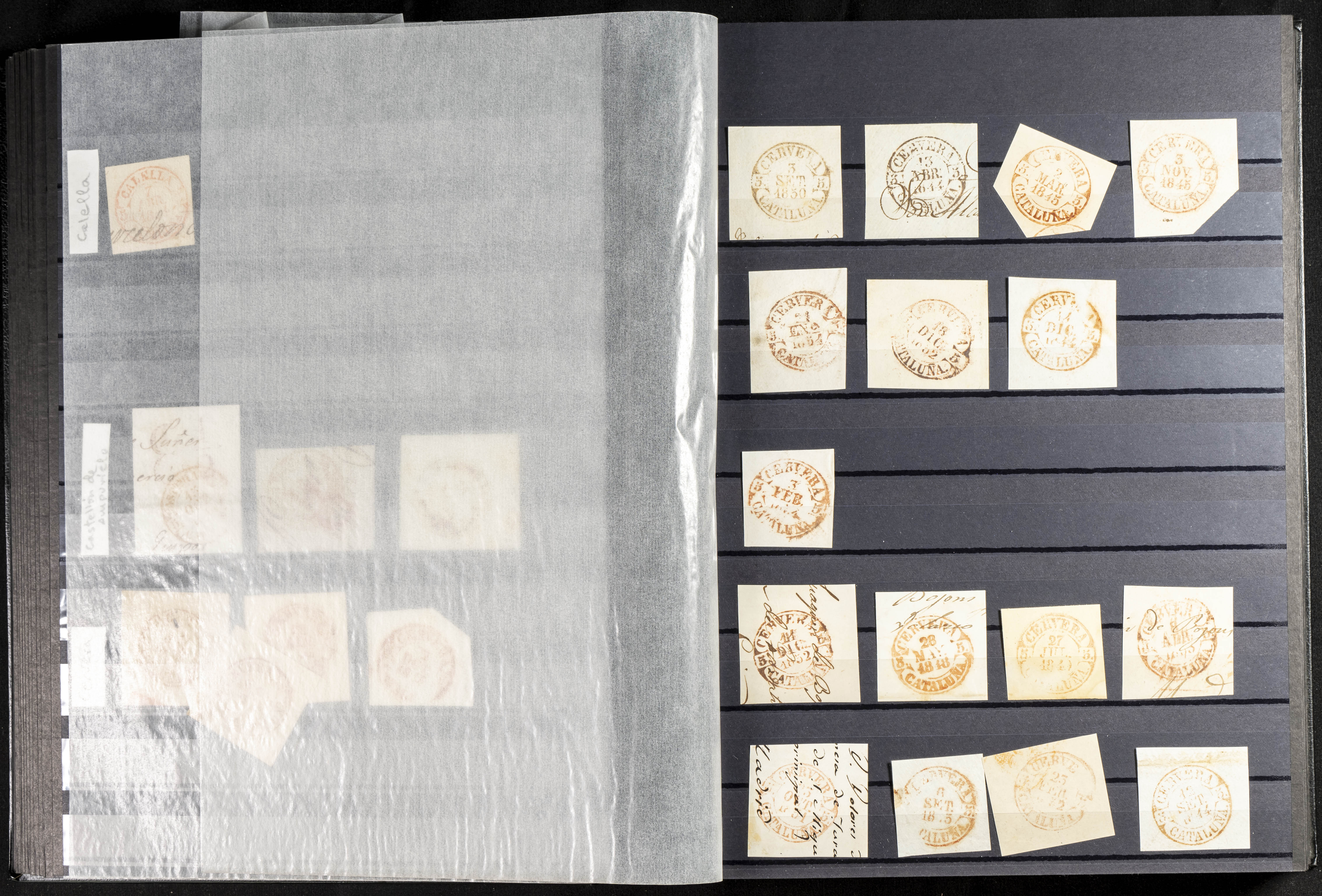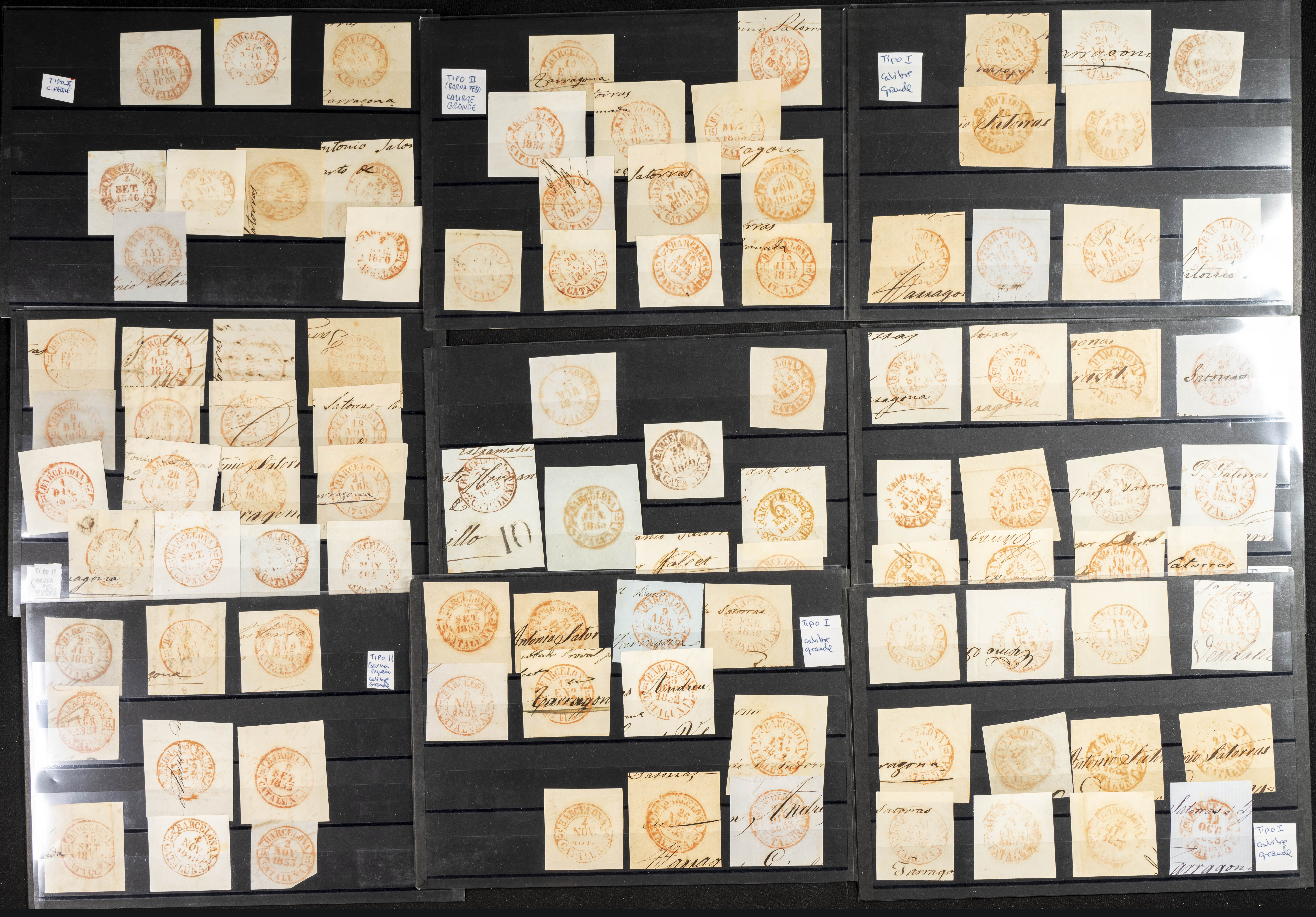(1850ca). Estudio de referencia de Pedro Monge con más de mil cuatrocientos fragmentos recortados de fechadores originales tipo "baeza" de las demarcaciones postales de Aragón y Cataluña, muchos de gran calidad e incluyendo algunos baezas de Madrid capital. A EXAMINAR.