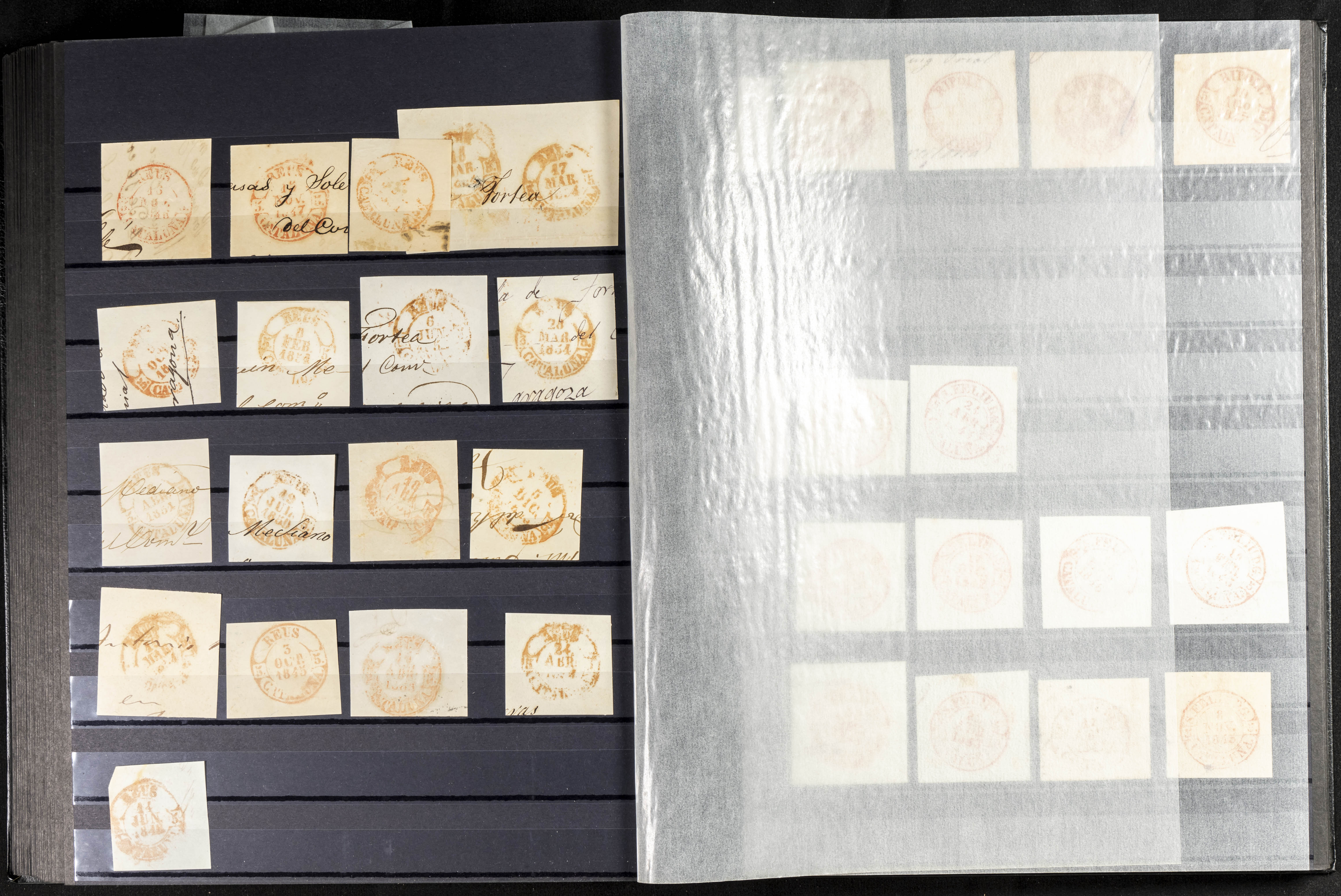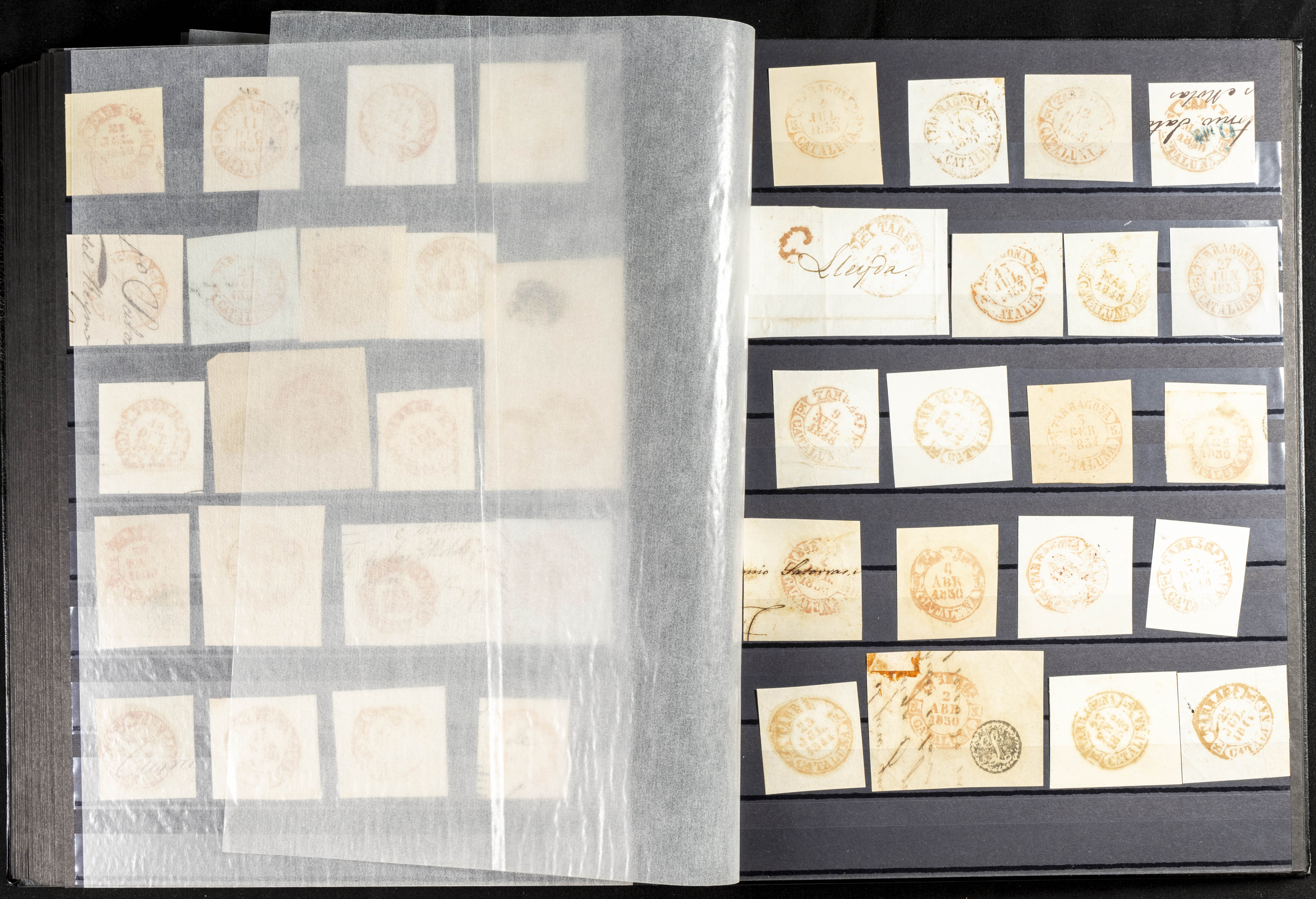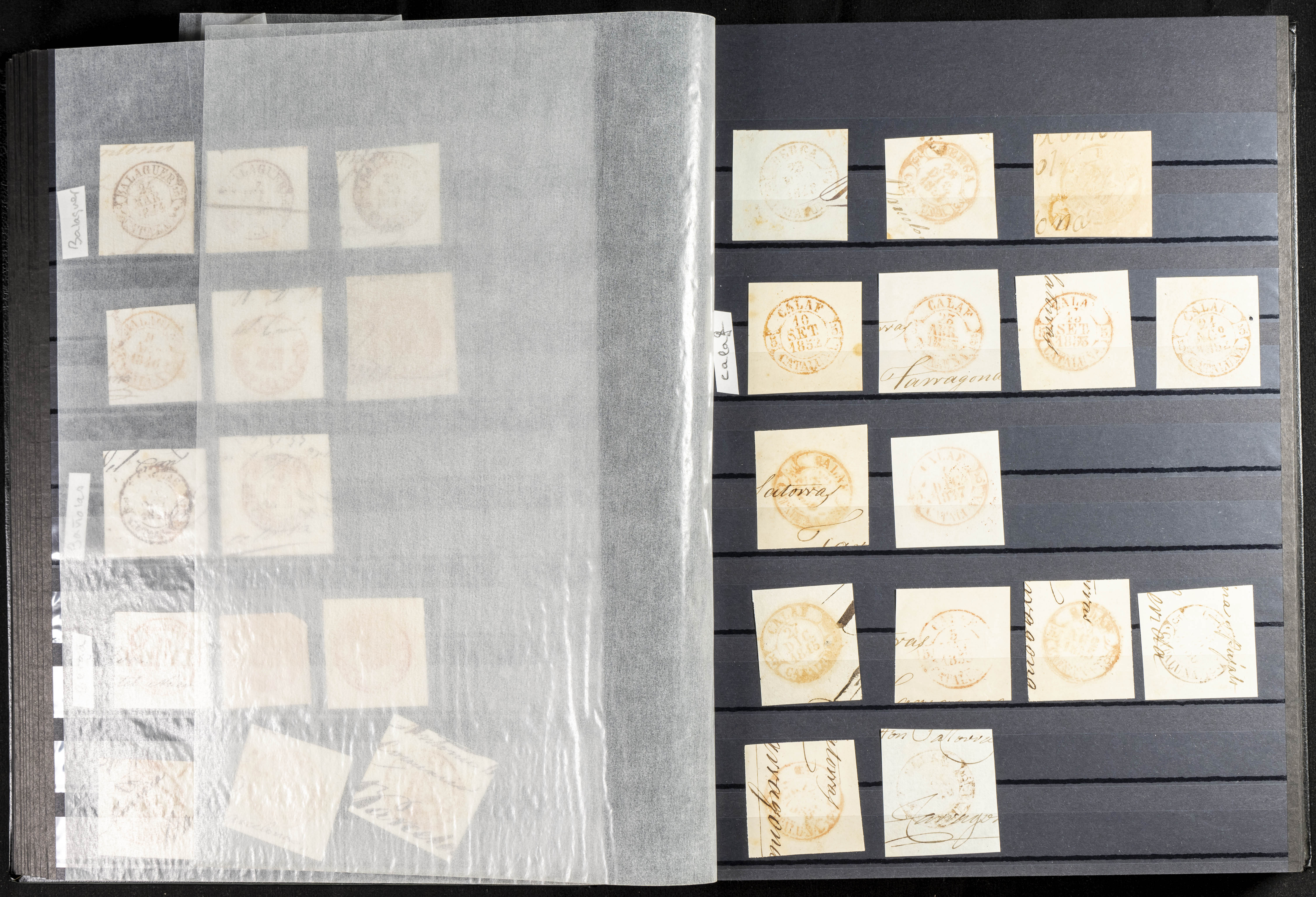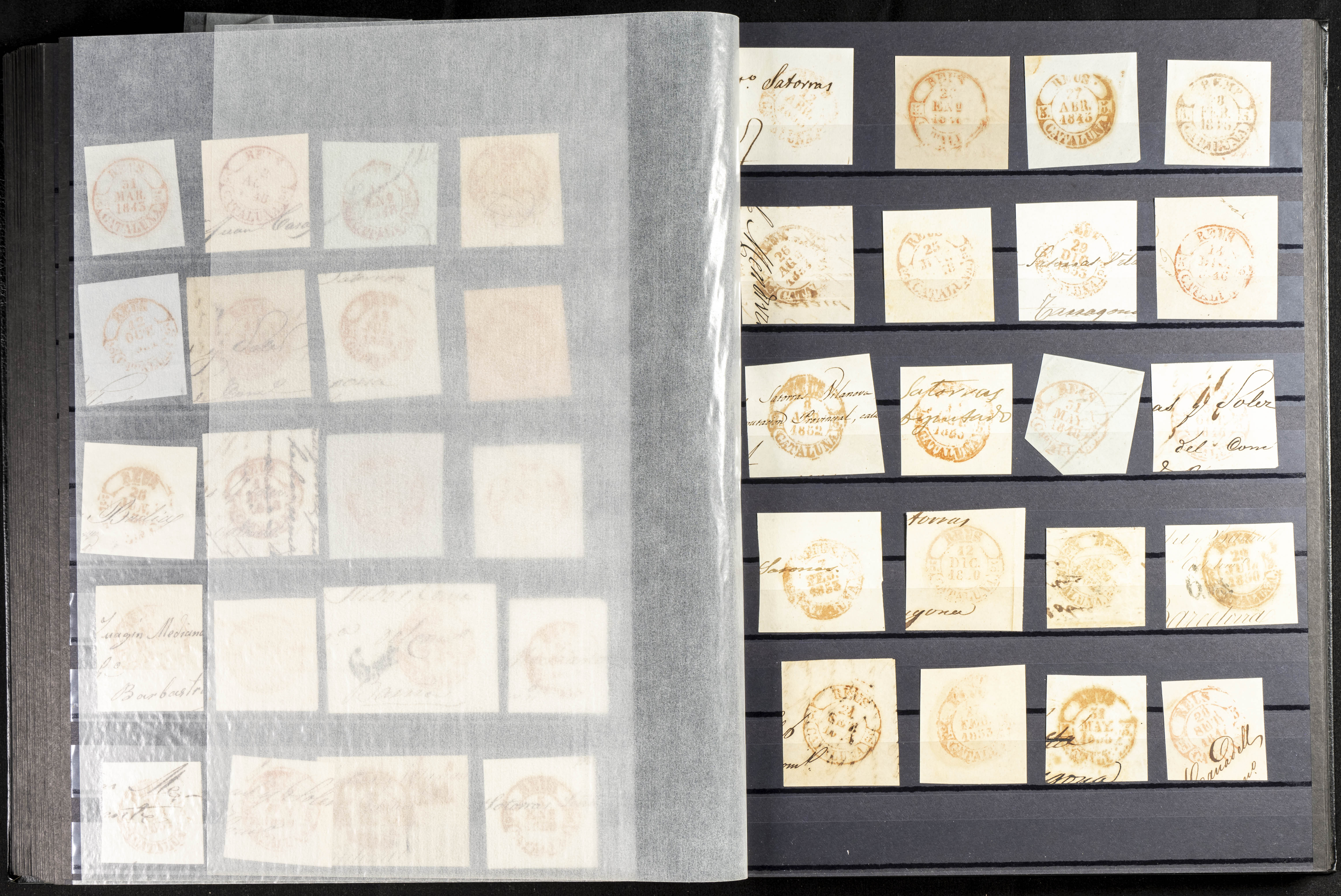 (1850ca). Estudio de referencia de Pedro Monge con más de mil cuatrocientos fragmentos recortados de fechadores originales tipo "baeza" de las demarcaciones postales de Aragón y Cataluña, muchos de gran calidad e incluyendo algunos baezas de Madrid capital. A EXAMINAR.