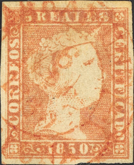 3. 1850. 5 reales rojo (reparado). Matasello baeza AGRAMUNT / CATALUÑA. MAGNIFICO Y ESPECTACULAR.