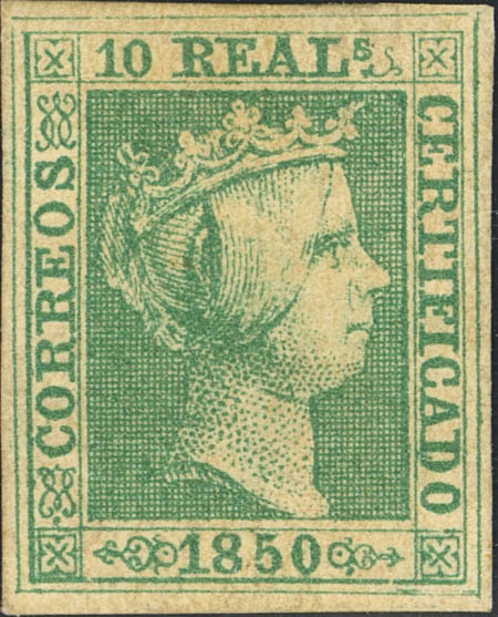 ★ 5. 1850. 10 reales verde. Color intenso y buenos márgenes. PIEZA DE LUJO. Cert. COMEX.
