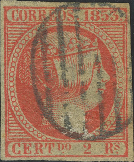 19F. 1853. 2 reales bermellón. FALSO SPERATI, sin firma de Jean Sperati y sin marca de la B.P.A. MAGNIFICO.