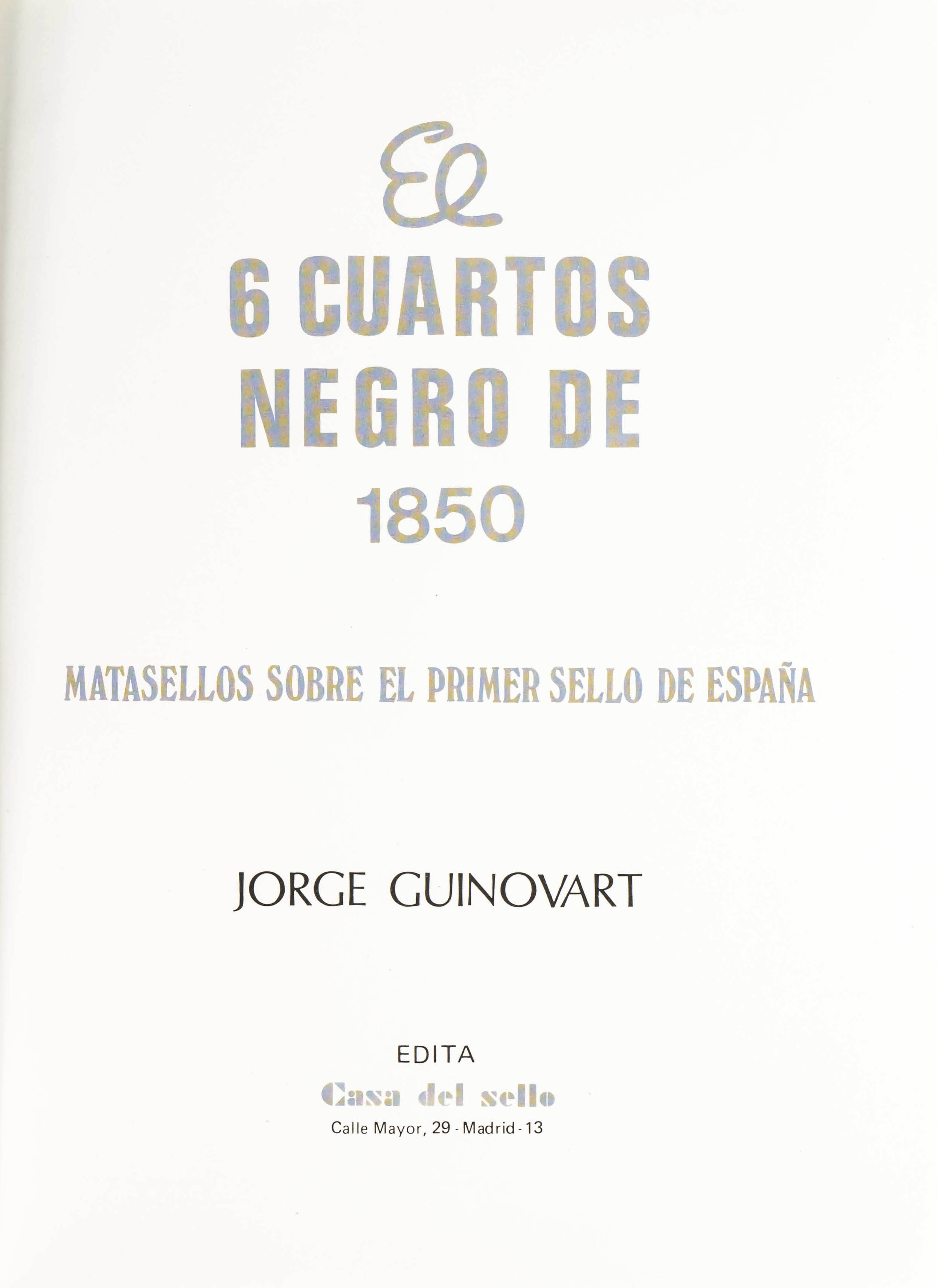 1984. 6 CUARTOS NEGRO DE 1850 MATASELLOS SOBRE EL PRIMER SELLO DE ESPAÑA. Jorge Guinovart. Casa del Sello. Madrid, 1984 (encuadernado en piel con detalles de oro).