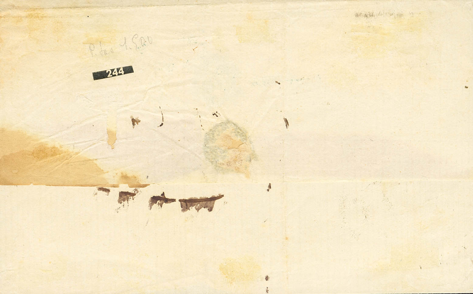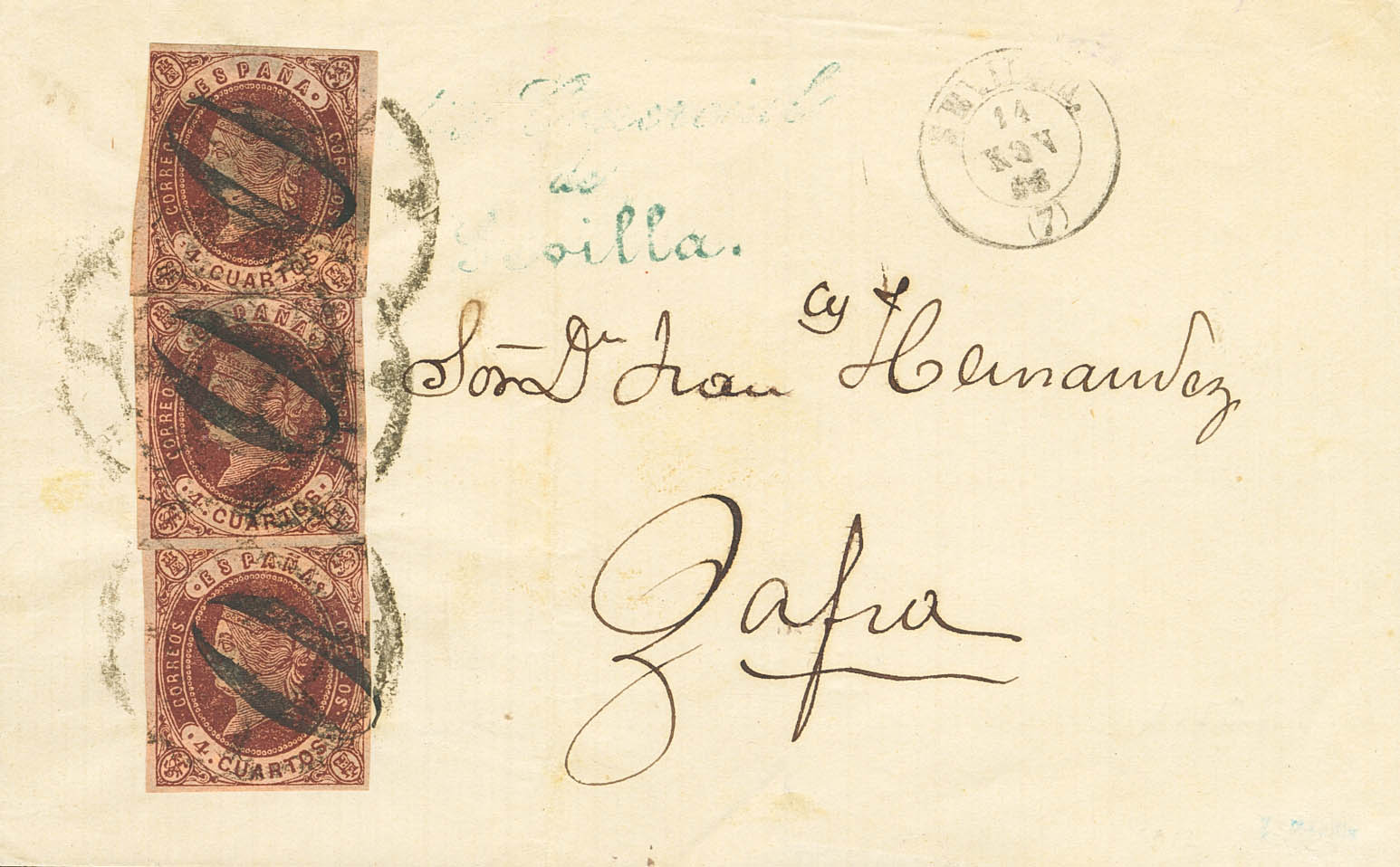 58(3). 1863. 4 cuartos castaño, tres sellos. SEVILLA a ZAFRA. Matasello mixto R.CARRETA Nº7 y numeral "O", estampado a la llegada a Zafra. MAGNIFICA Y MUY RARA, ESPECIALMENTE TRATANDOSE DE UN FRANQUEO DE TRIPLE PORTE. Cert. GRAUS.
