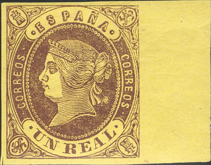 ★ 61. 1862. 1 real castaño sobre amarillo, borde de hoja. PIEZA DE LUJO.