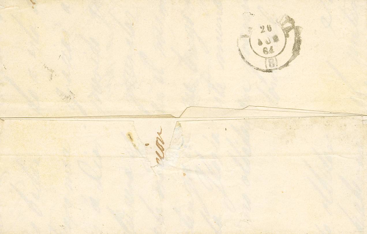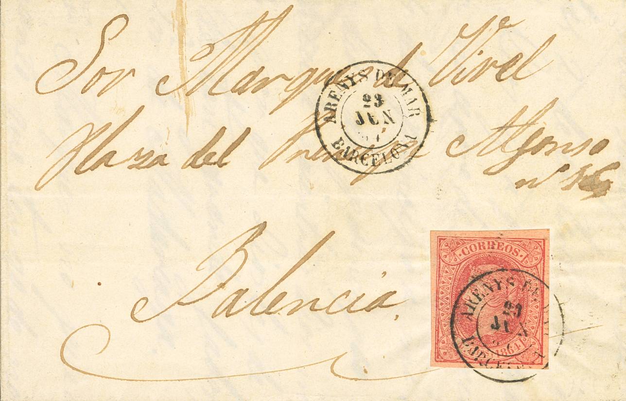 64. 1864. 4 cuartos rojo. AREYNS DEL MAR (BARCELONA) a VALENCIA. Matasello AREYNS DEL MAR / BARCELONA. MAGNIFICA.