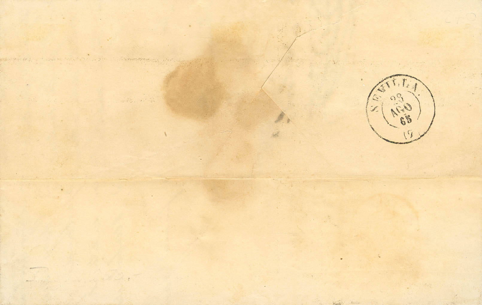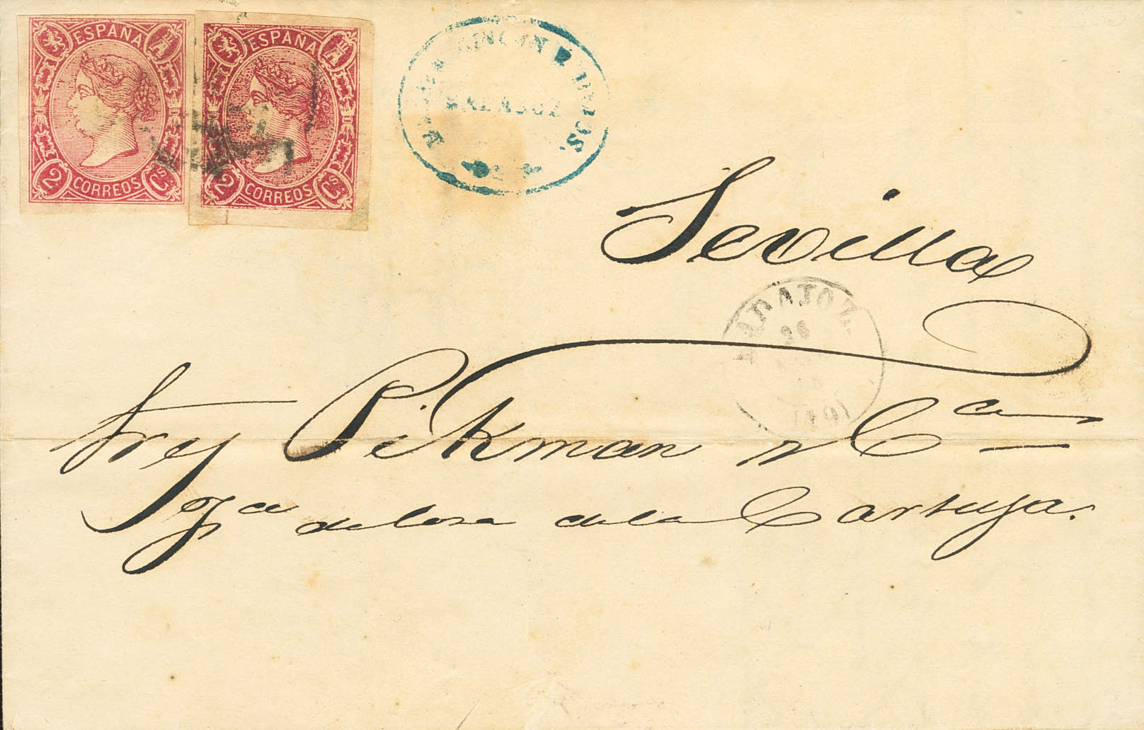 69(2). 1865. 2 cuartos carmín, dos sellos. BADAJOZ a SEVILLA. BONITA E INUSUAL COMBINACION PARA COMPLETAR EL FRANQUEO DE 4 CUARTOS.