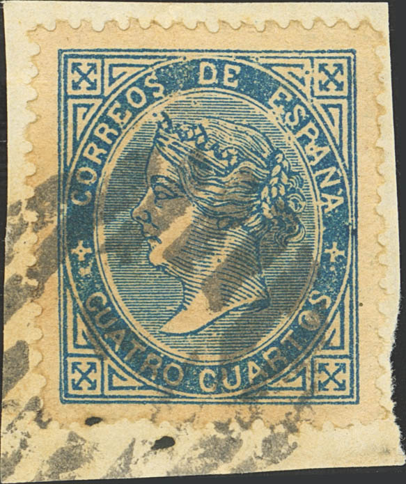 △ 88F. 1867. 4 cuartos azul FALSO POSTAL TIPO UNICO, sobre fragmento. Matasello PARRILLA Nº1, de Madrid. MAGNIFICO Y RARO.