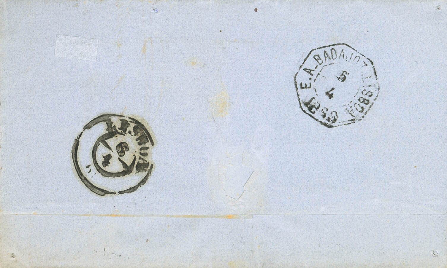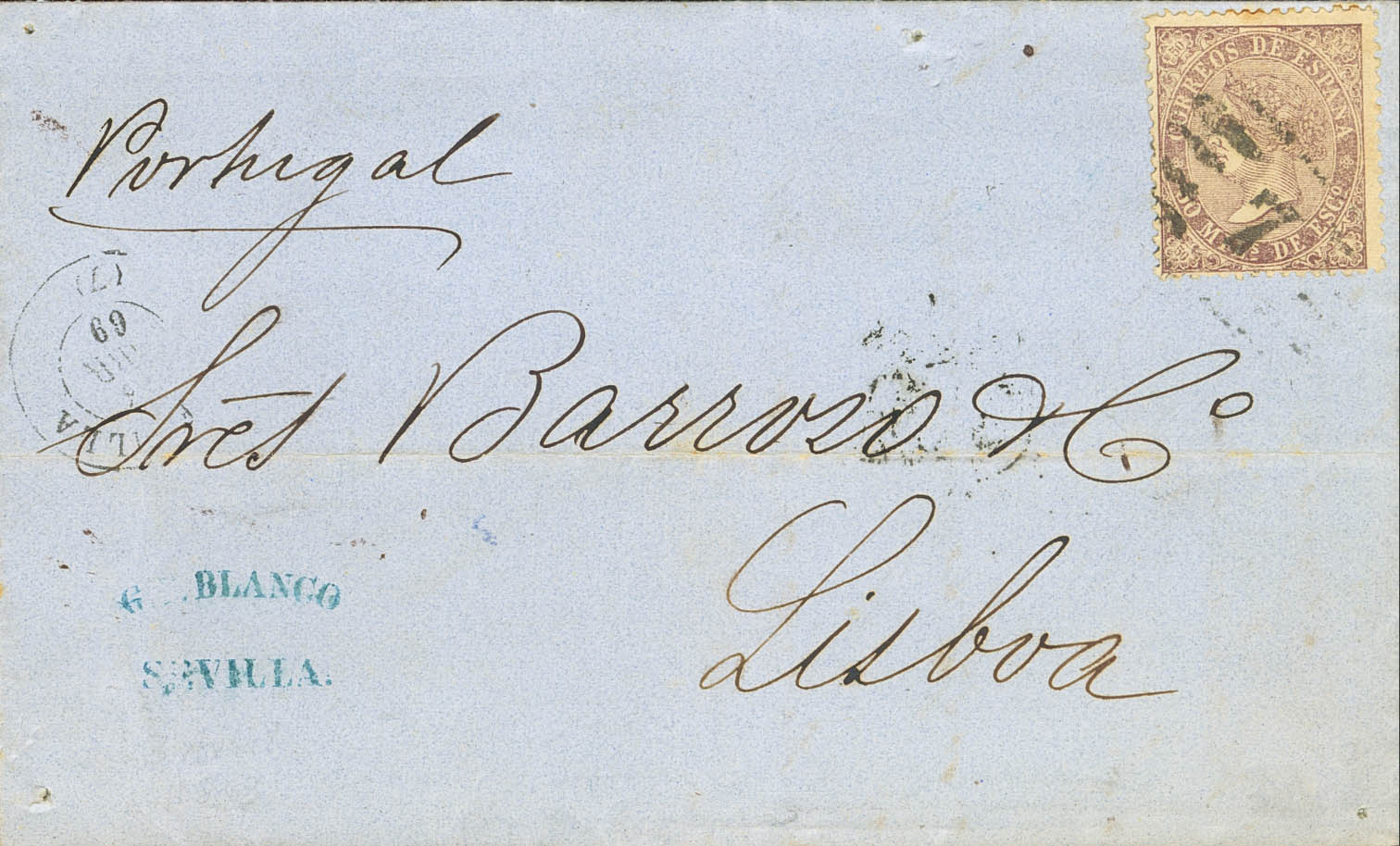 98. 1869. 50 mils violeta castaño. SEVILLA a LISBOA (PORTUGAL). Matasello PARRILLA Nº7. MAGNIFICA E INUSUAL CON LA NUEVA TARIFA DE 50 MILS A PORTUGAL.