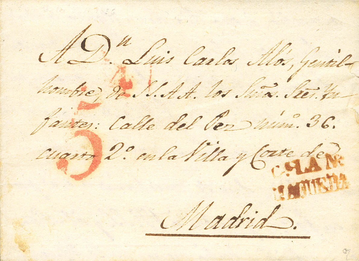 1836. NOMBELA (TOLEDO) a MADRID. Marca Cª LA Nª / MAQUEDA, en rojo (P.E.2) edición 2004. MAGNIFICA Y MUY RARA.