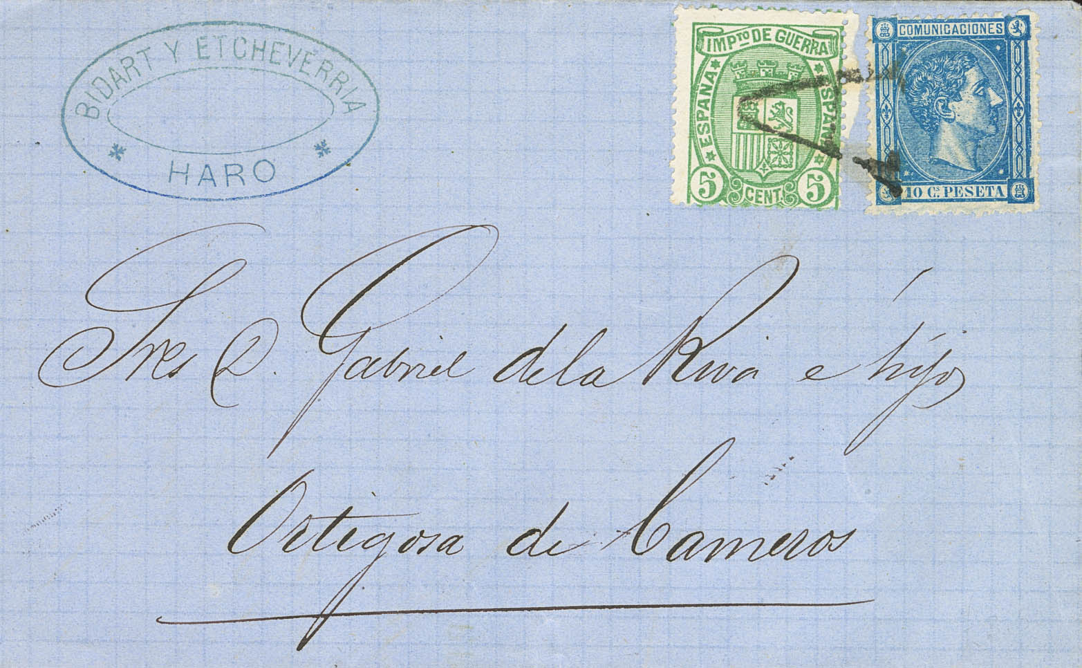 164, 154. 1875. 10 cts azul y 5 cts verde. HARO a ORTIGOSA DE CAMEROS. Matasello de abono "A", de Haro. MAGNIFICA Y RARA.