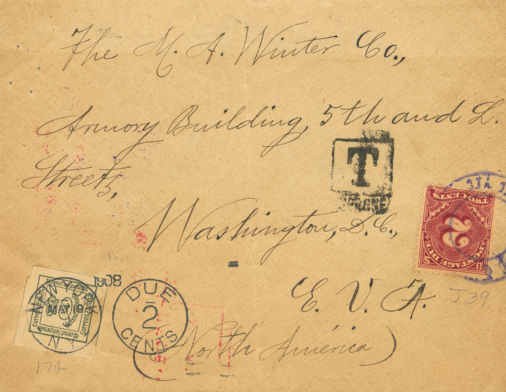 176. 1908. ¼ cts verde. Dirigida a WASHINGTON (U.S.A.). Tasada a la llegada por falta de franqueo (si se trataba de Papeles de Negocio o impresos debería ir franqueada con 5 cts), aplicando sello de tasas norteamericano de 2 ctvos carmín y dúplex NEW YORK / N.Y. / DUE / 2 / CTS sobre el sello de ¼. MAGNIFICA.