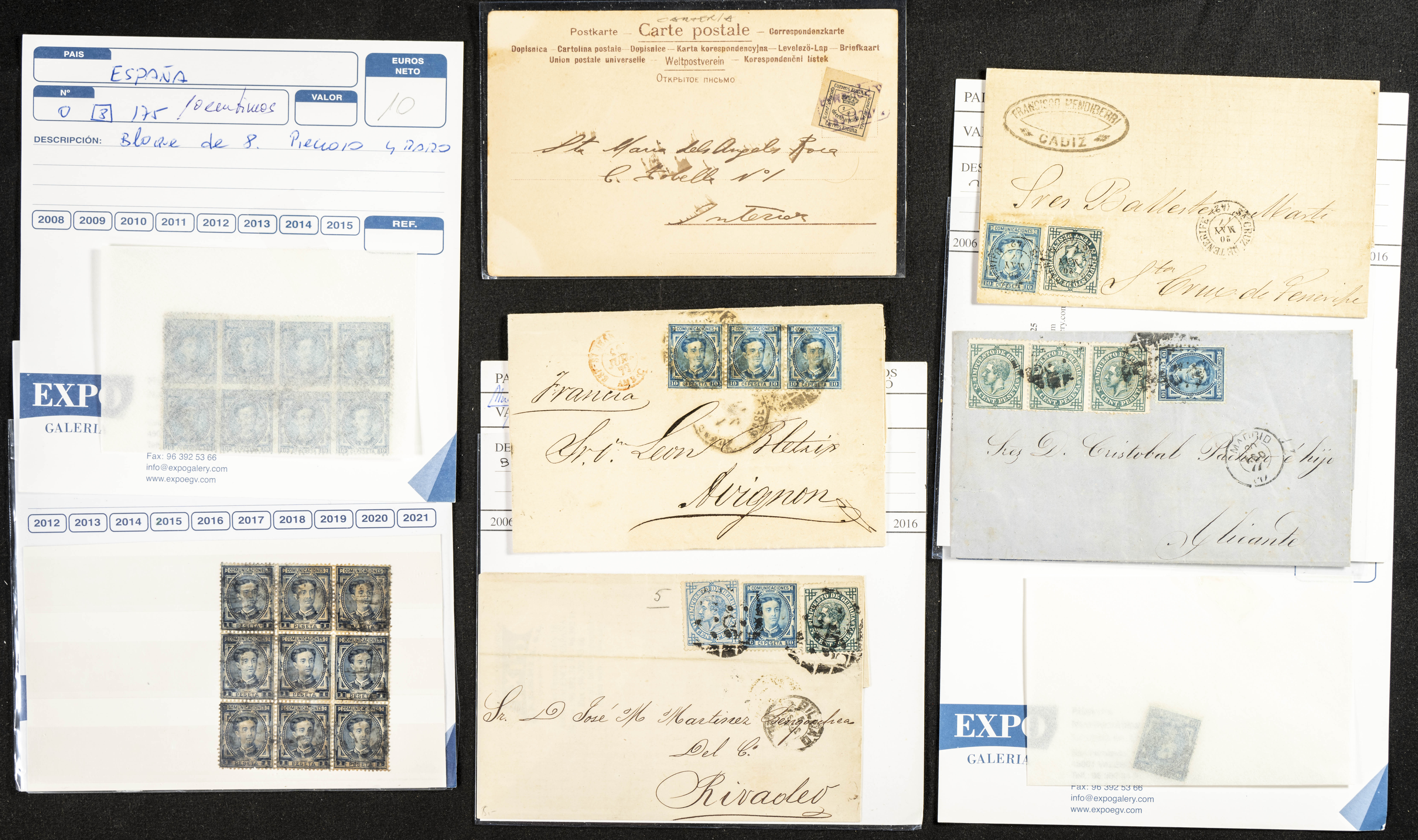 (1876ca). Interesante conjunto de sellos sueltos, bloques y cartas de la Emisión de Alfonso XII de 1876 (Filigrana Castillo), incluye algunos sellos sin dentar, tres cartas con sellos de Impuesto de Guerra, una dirigida a Francia y tres dirigidas a Buenos Aires con sellos de 25 cts y 50 cts, entre otras (algunos montados en fichas de subastas). A EXAMINAR.