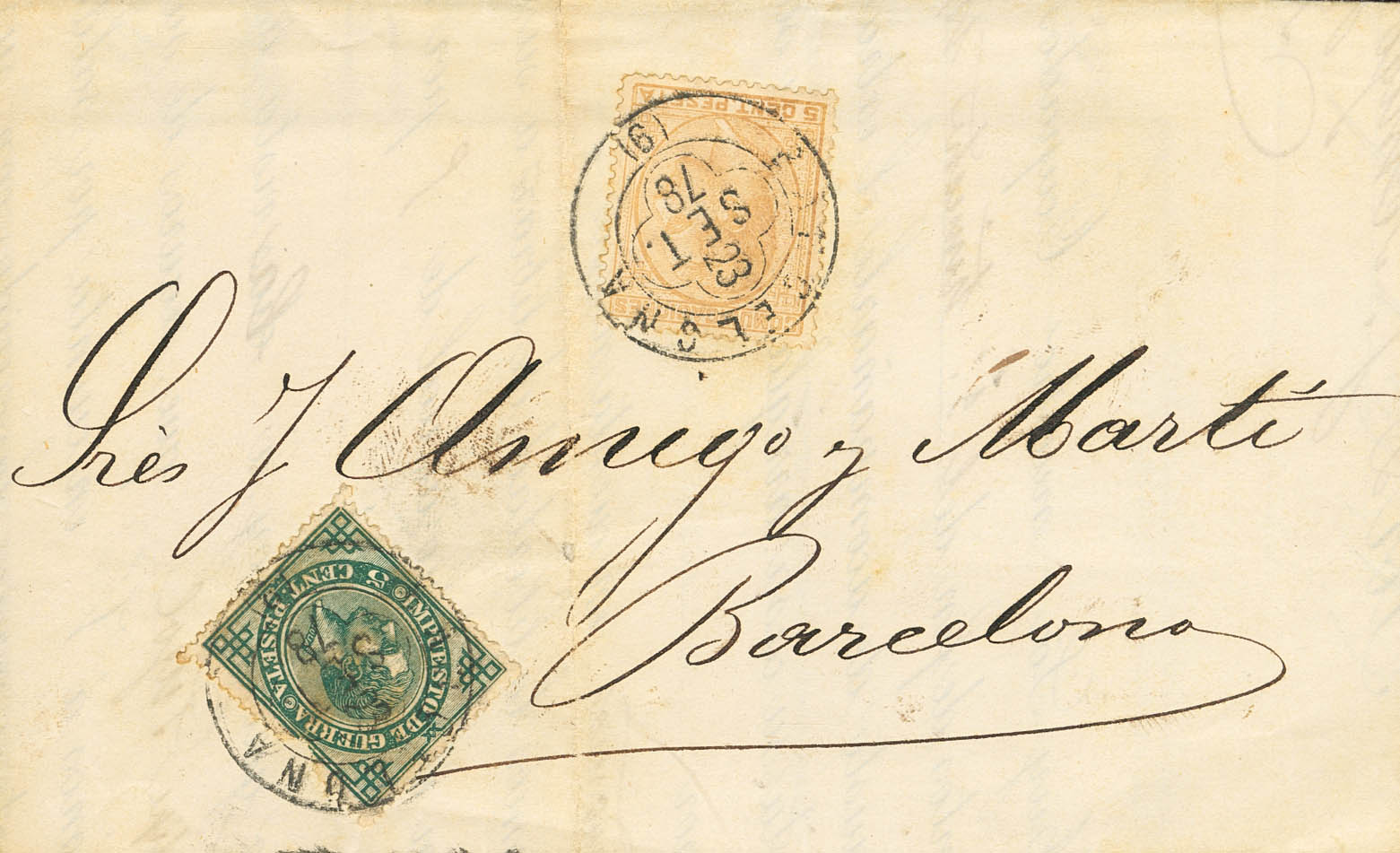 191, 183. 1878. 5 cts naranja y 5 cts verde. Correo Interior de BARCELONA. Matasello tipo trébol BARCELONA / (9). MAGNIFICA Y RARA.