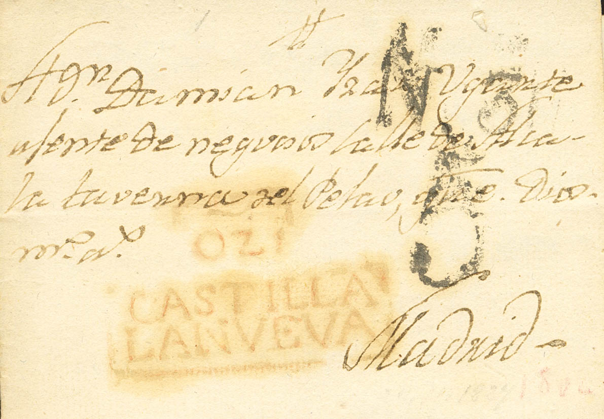 1827. LOS YEBENES (TOLEDO) a MADRID. Marca OZ / CASTILLA / LANUEVA, en rojo de Orgaz en tránsito (P.E.2) edición 2004. MAGNIFICA Y MUY RARA.