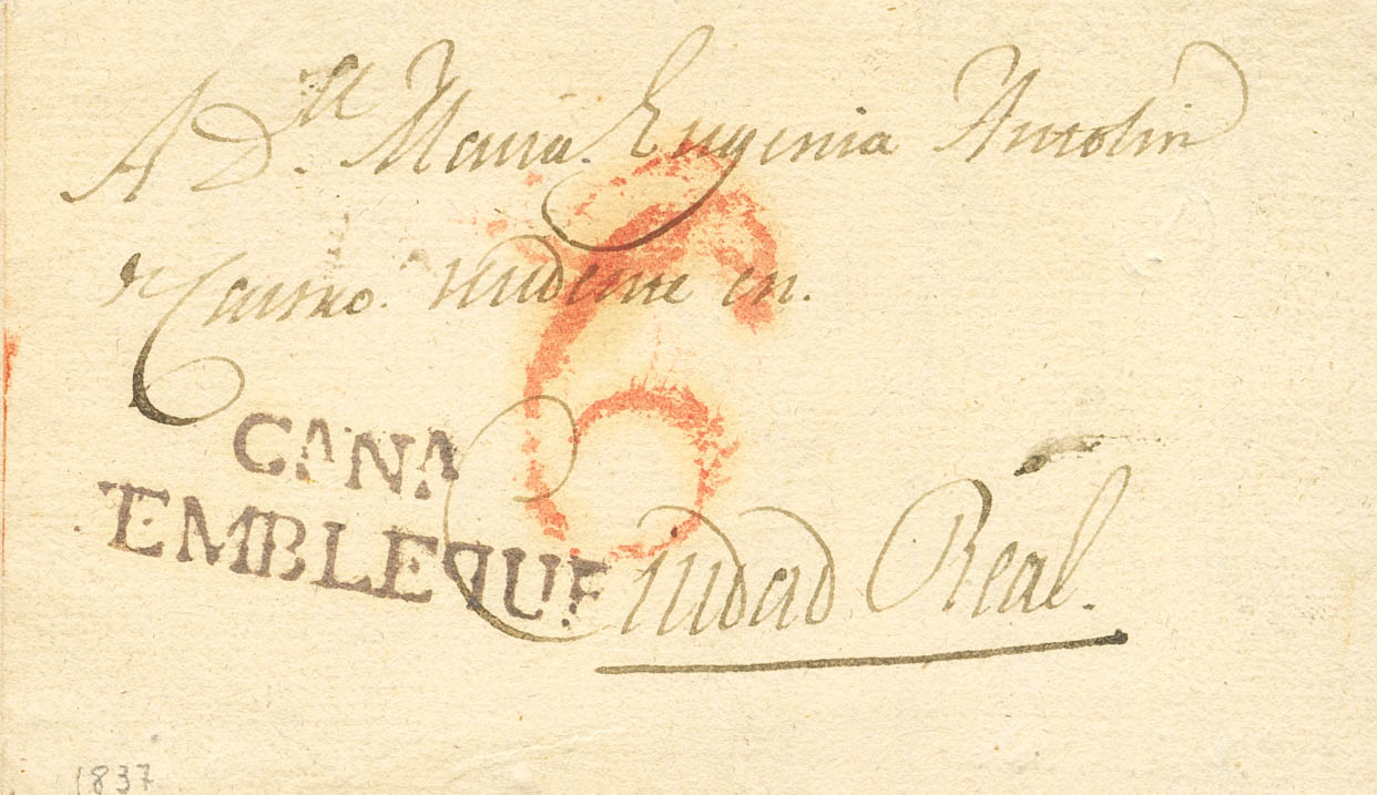1837. VILLACAÑAS (TOLEDO) a CIUDAD REAL. Marca Cª Nª / TEMBLEQUE, en negro (P.E.1) edición 2004. MAGNIFICA.