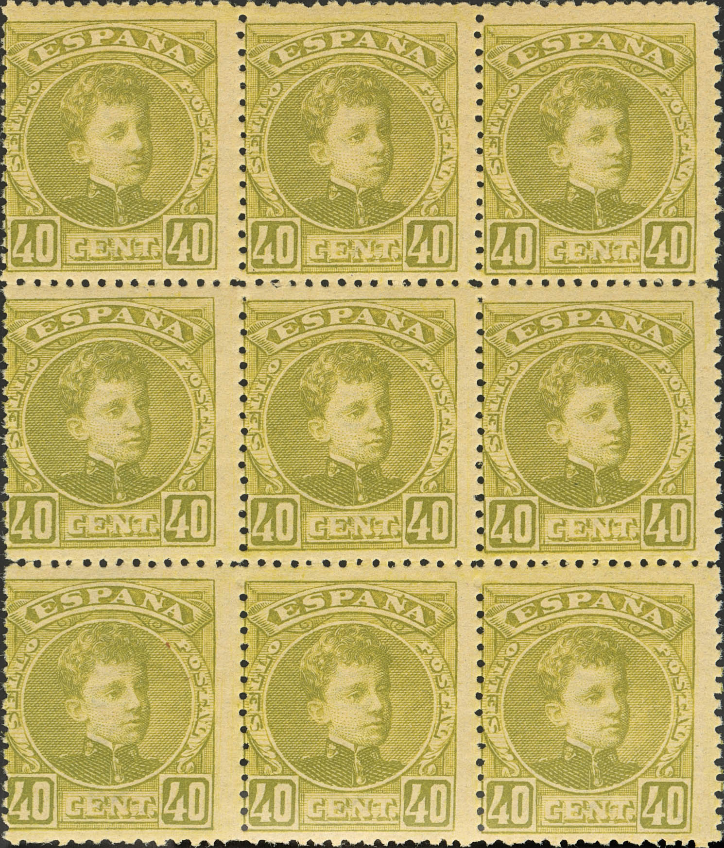 ★★ 250(9). 1901. 40 cts verde oliva, bloque de nueve. BONITO Y RARISIMOS LOS MULTIPLOS DE ESTE VALOR. Edifil 2020: +2.350 Euros