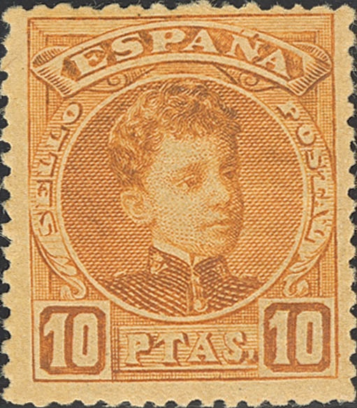 ★★ 255. 1901. 10 pts naranja. Muy bien centrado. MAGNIFICO Y RARO SIN FIJASELLOS. Cert. CEM. Edifil 2025: 430 Euros