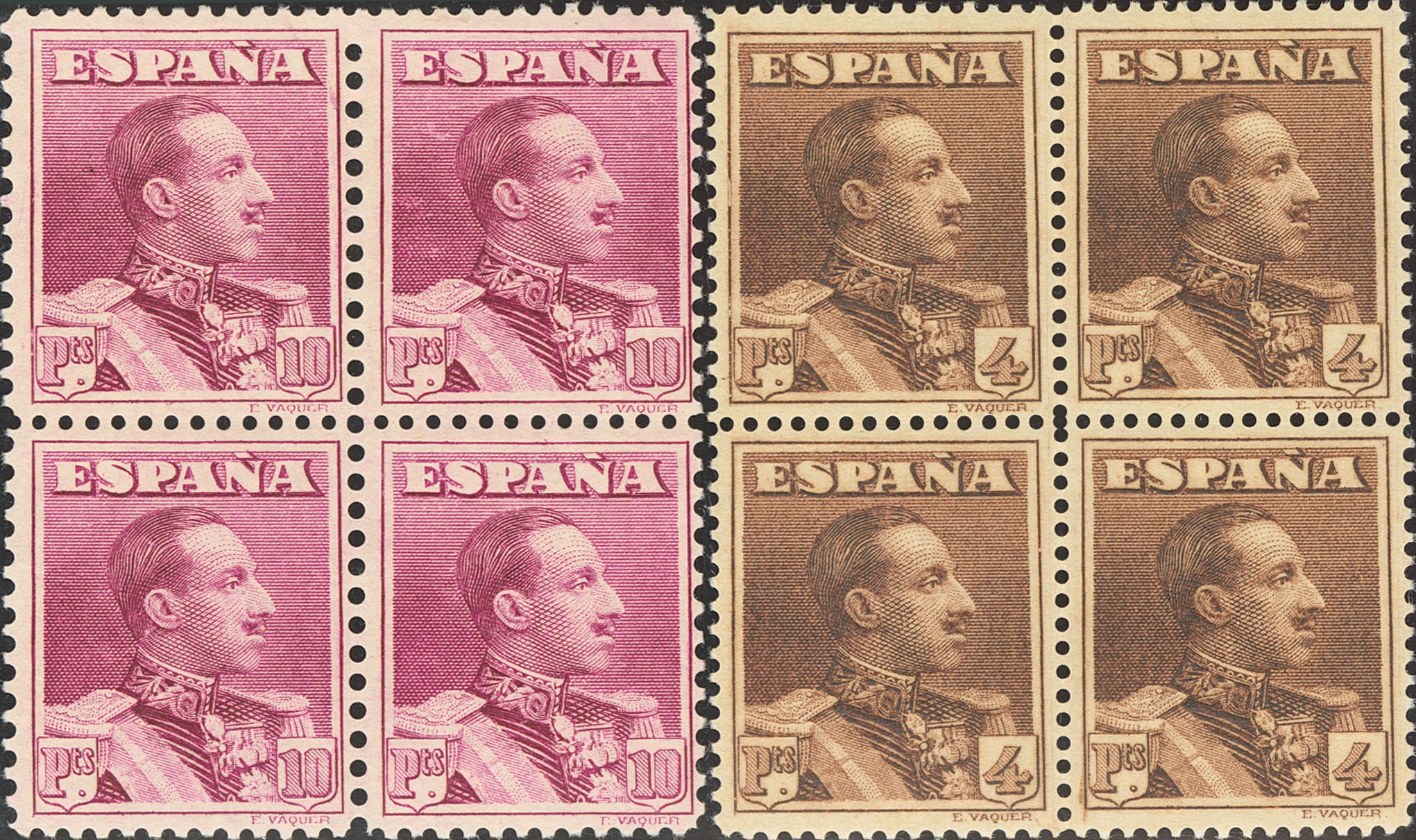 ★★/★ 322/23ec(4). 1922. 4 pts y 10 pts (los dos sellos superiores del 4 pts tienen fijasellos). COLORES CAMBIADOS. MAGNIFICOS Y RAROS. Edifil 2020: 696 Euros