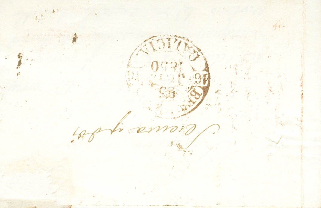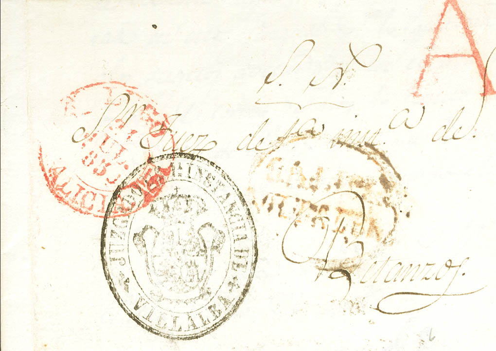 1850. LUGO a BETANZOS (CORUÑA). Marca de GALICIA / VILLALBA, en rojo (P.E.2) edición 2004 y "A", en rojo de Lugo aplicada en tránsito (P.E.15). MAGNIFICA.