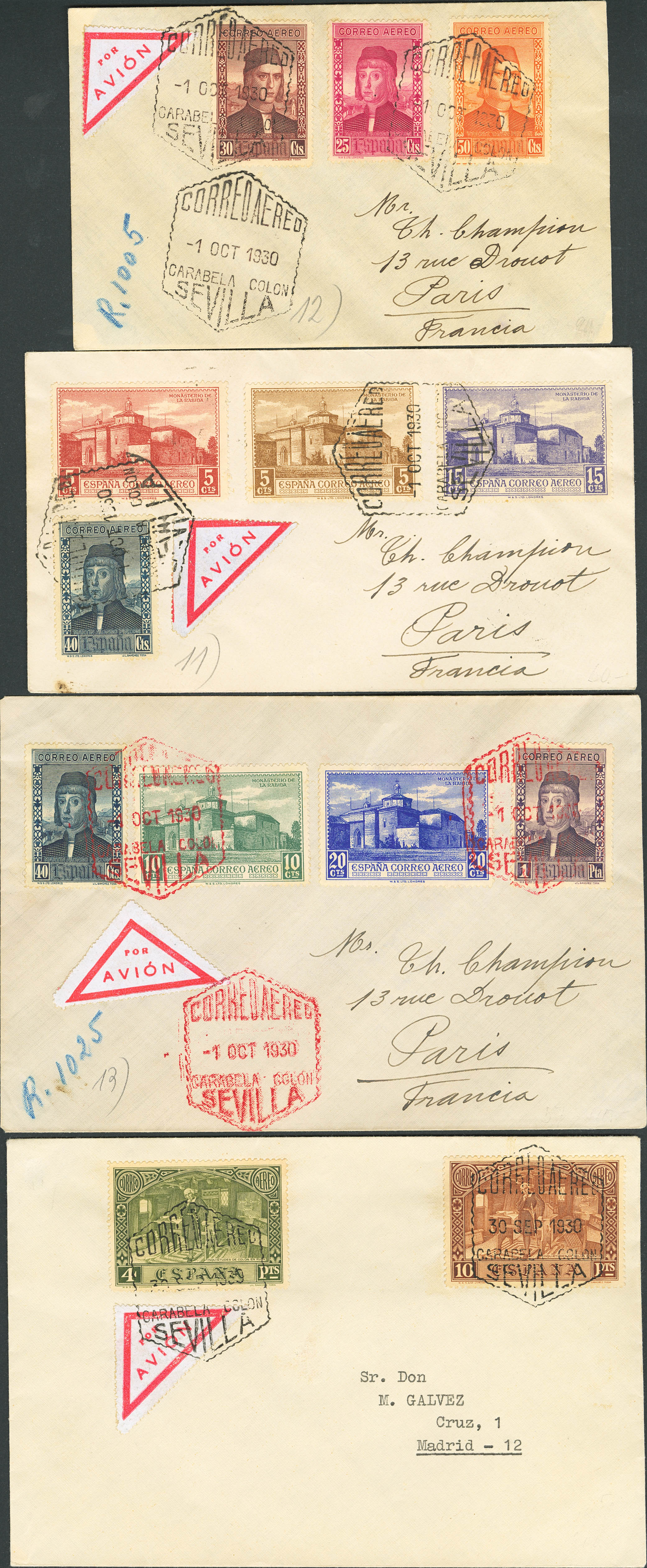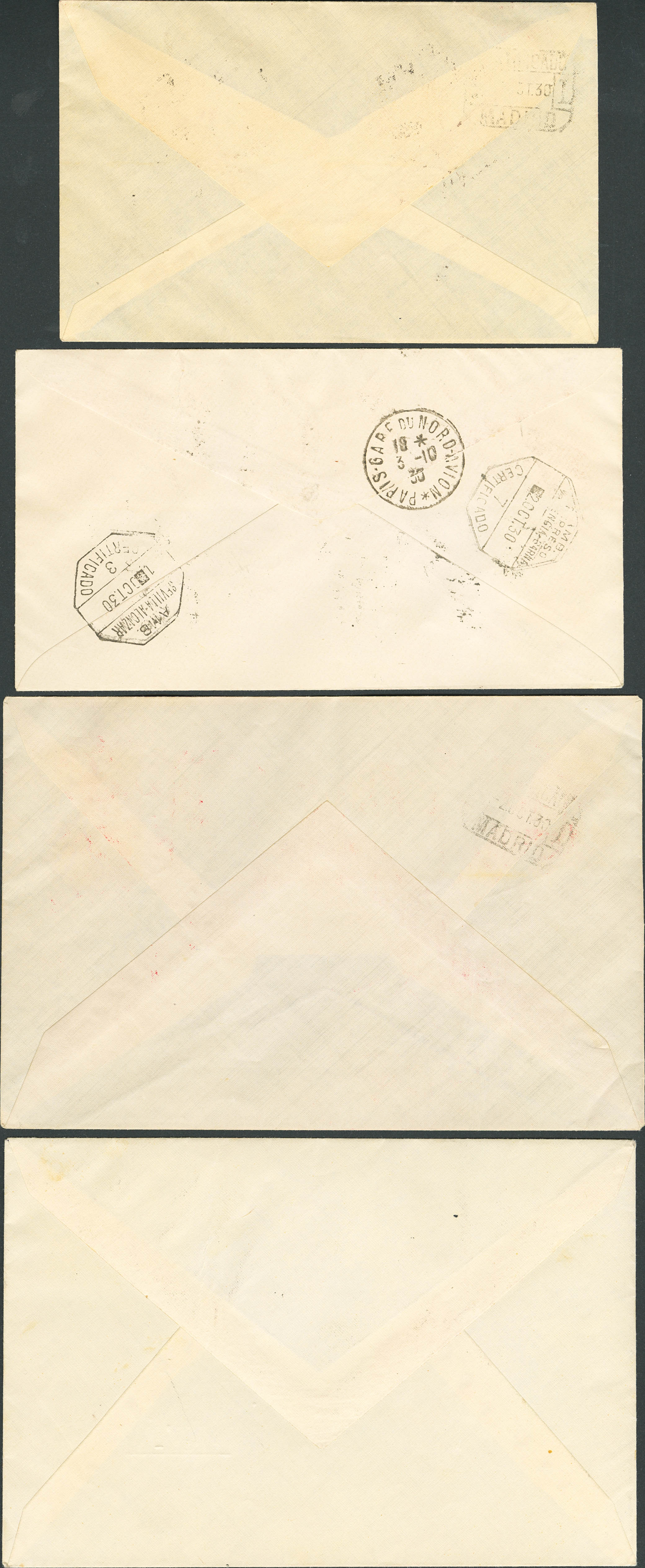 547/58. 1930. Serie completa circulada en cuatro cartas. MAGNIFICAS.