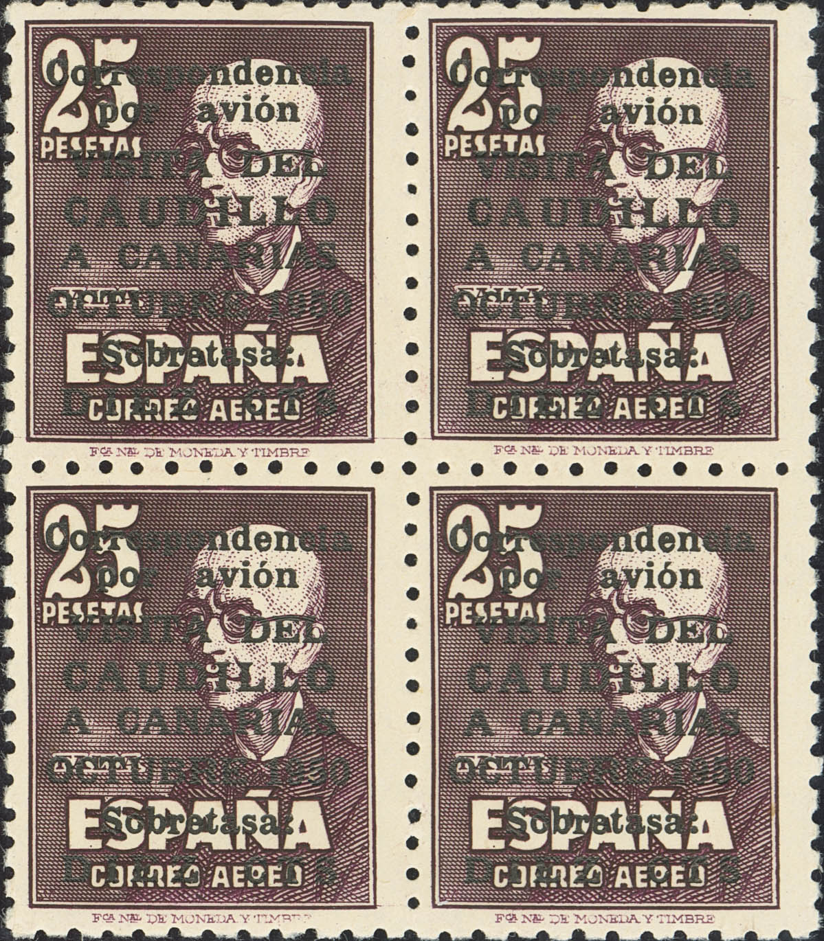 ★★ 1083(4). 1950. CAUDILLO A CANARIAS SIN NUMERO, bloque de cuatro. Excelente centraje. MAGNIFICO Y MUY RARO. Cert. CEM. Edifil 2021: 23.500 Euros