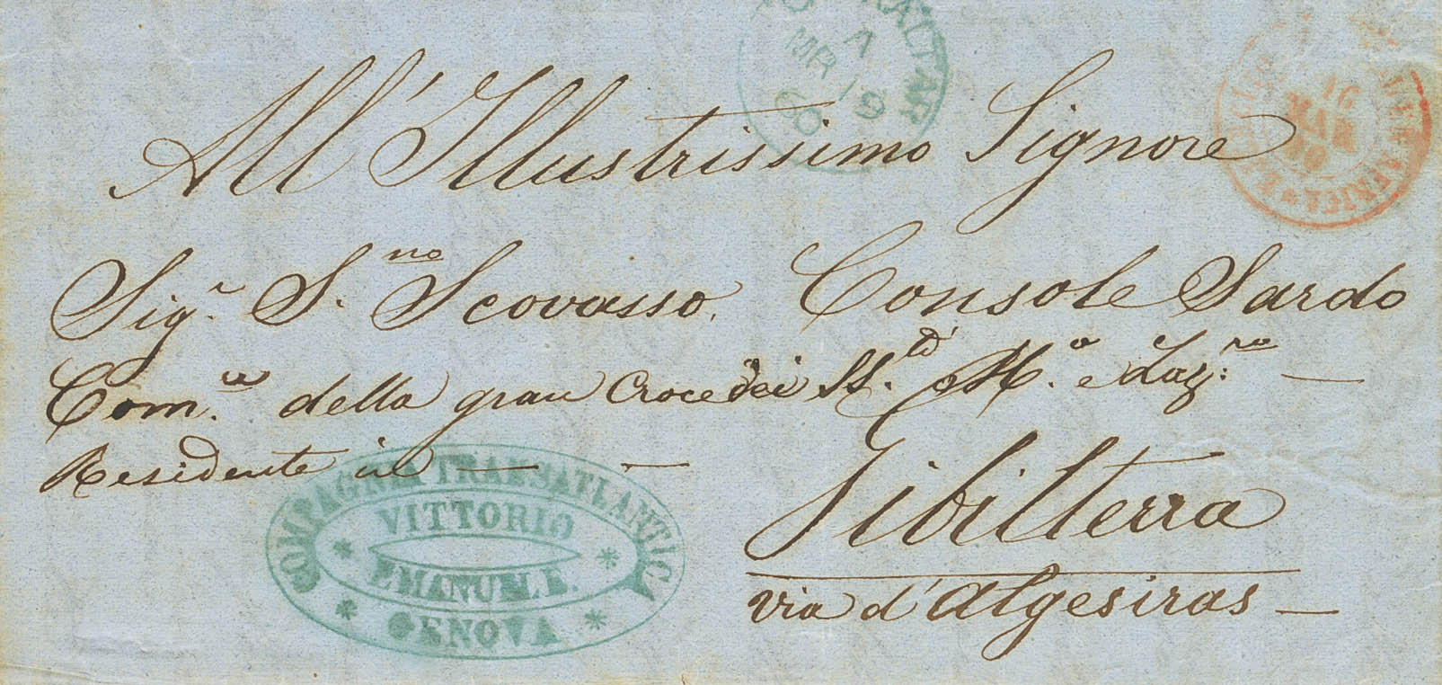1860. TETUAN a GIBRALTAR, remitida desde la Rada de Tetuán a bordo del Piróscafo Sardo Vittorio Emanuele, de la Compañía Transatlántica Sarda (marca en azul). Fechador EJERCITO ESPAÑOL EN AFRICA, en rojo y llegada GIBRALTAR, en azul. MAGNIFICA Y EXTRAORDINARIAMENTE RARA, POSIBLEMENTE UNICA CONOCIDA DIRIGIDA A GIBRALTAR CON LA MARCA DEL EJERCITO DE AFRICA Y TRANSPORTADA POR CORREO MARITIMO ITALIANO.