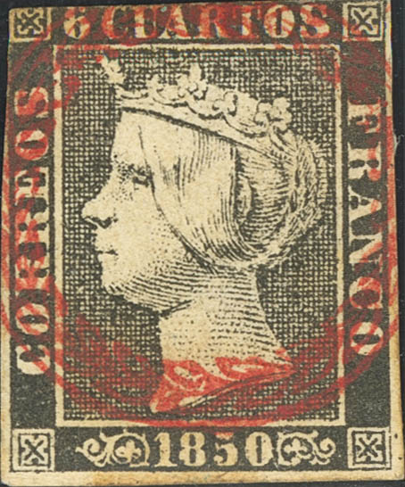 1. 1850. 6 cuartos negro. Matasello CORONA DE LAUREL, en rojo. MAGNIFICO Y EXTREMADAMENTE RARO. Cert. COMEX.