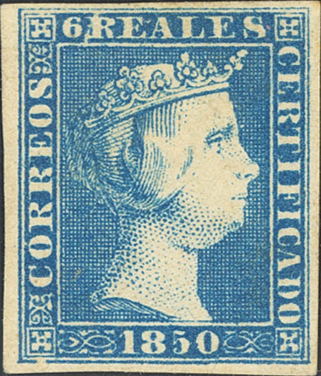 (★) 4. 1850. 6 reales azul. Color muy intenso y grandes márgenes. PIEZA DE LUJO. Cert. COMEX.