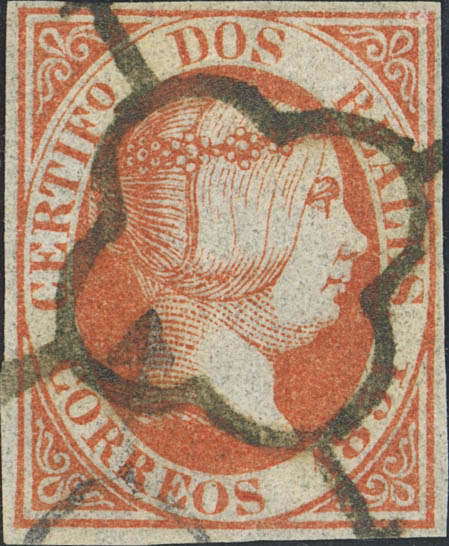 8. 1851. 2 reales naranja. Color muy intenso y matasello muy limpio que deja la efigie de la cara despejada. MAGNIFICO Y MUY RARO EN ESTA CALIDAD. Cert. CEM.