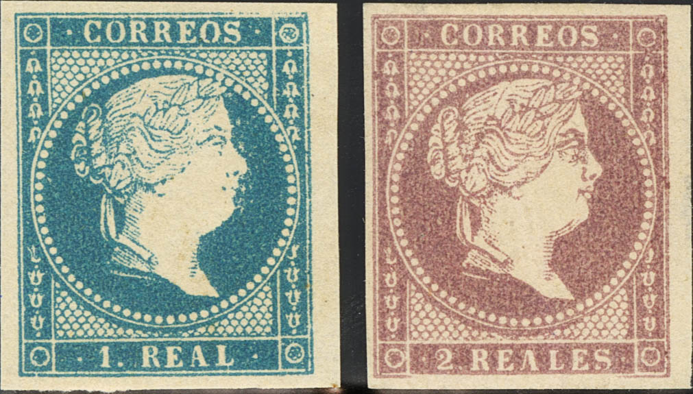 ★/(★) 49, 50. 1854. 1 real azul y 2 reales violeta. Márgenes grandes. MAGNIFICOS.