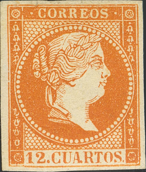 ★ NE1. 1855. 12 cuartos naranja NO EMITIDO. 1ª TIRADA. MAGNIFICO Y RARISIMO. Cert. GRAUS.