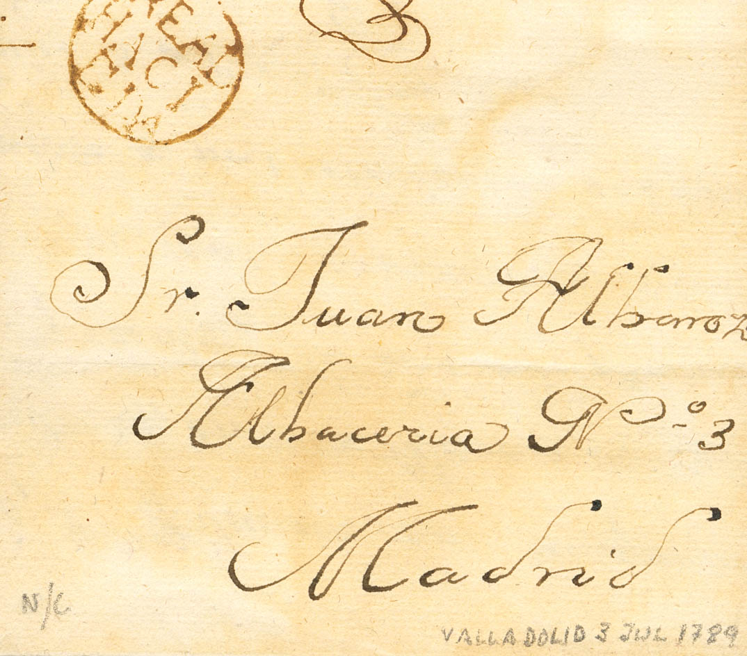 1789. VALLADOLID a MADRID. Marca de franquicia REAL / HACI / ENDA, en tinta de escribir. MAGNIFICA Y RARISIMA.