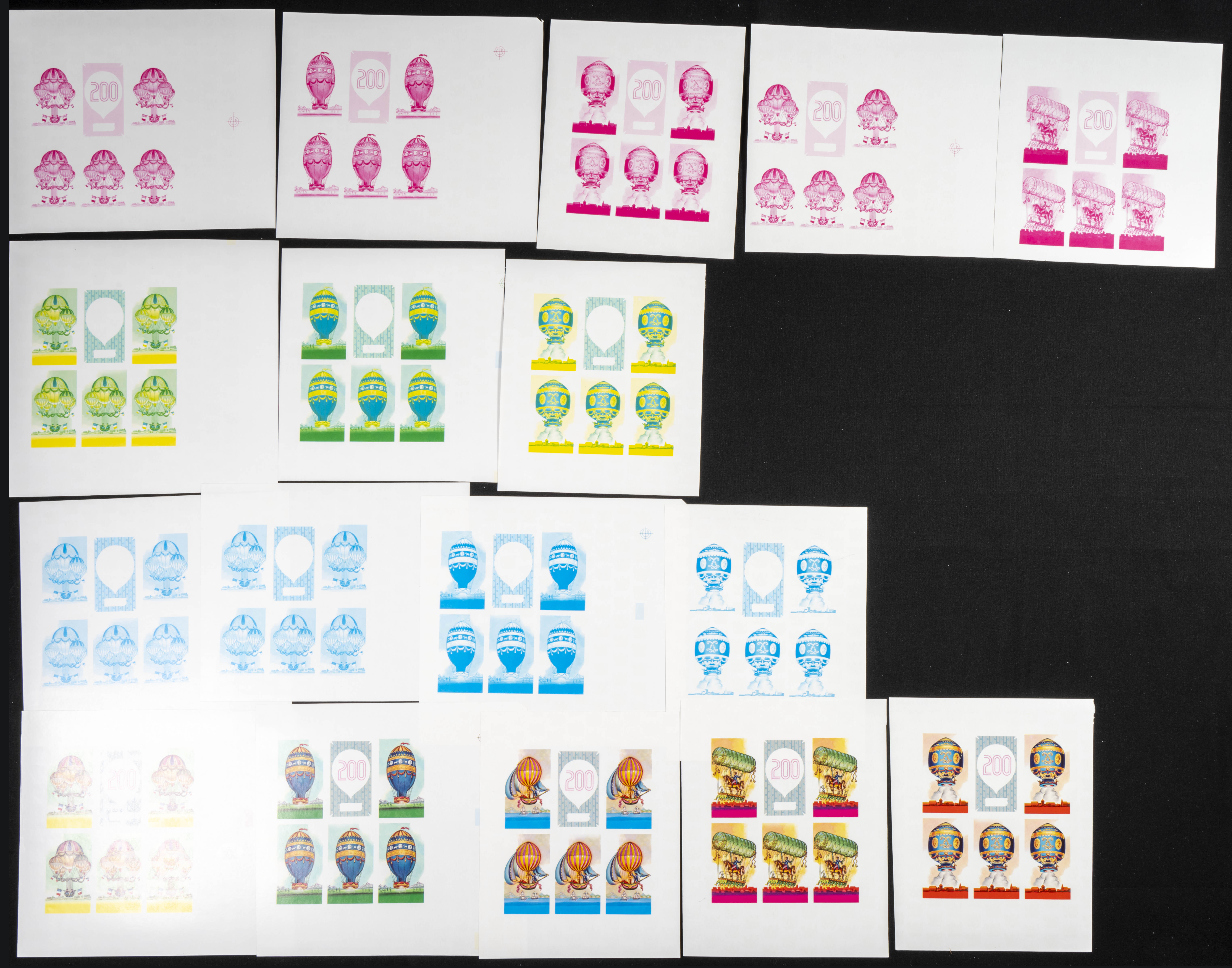 ★★Yvert . 1984. Aviation bi-centenary. Group of progressive plate proofs of the set. (Michel: 947/51). TO EXAM.